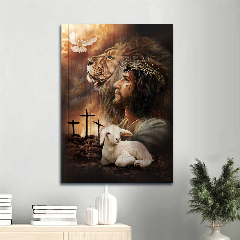 Add a hint of wonderlust to your walls with this Lion of Judah, Lamb of God, Dove of peace, Beautiful aspects of God - Jesus Portrait Canvas Prints, Christian Wall Art!
