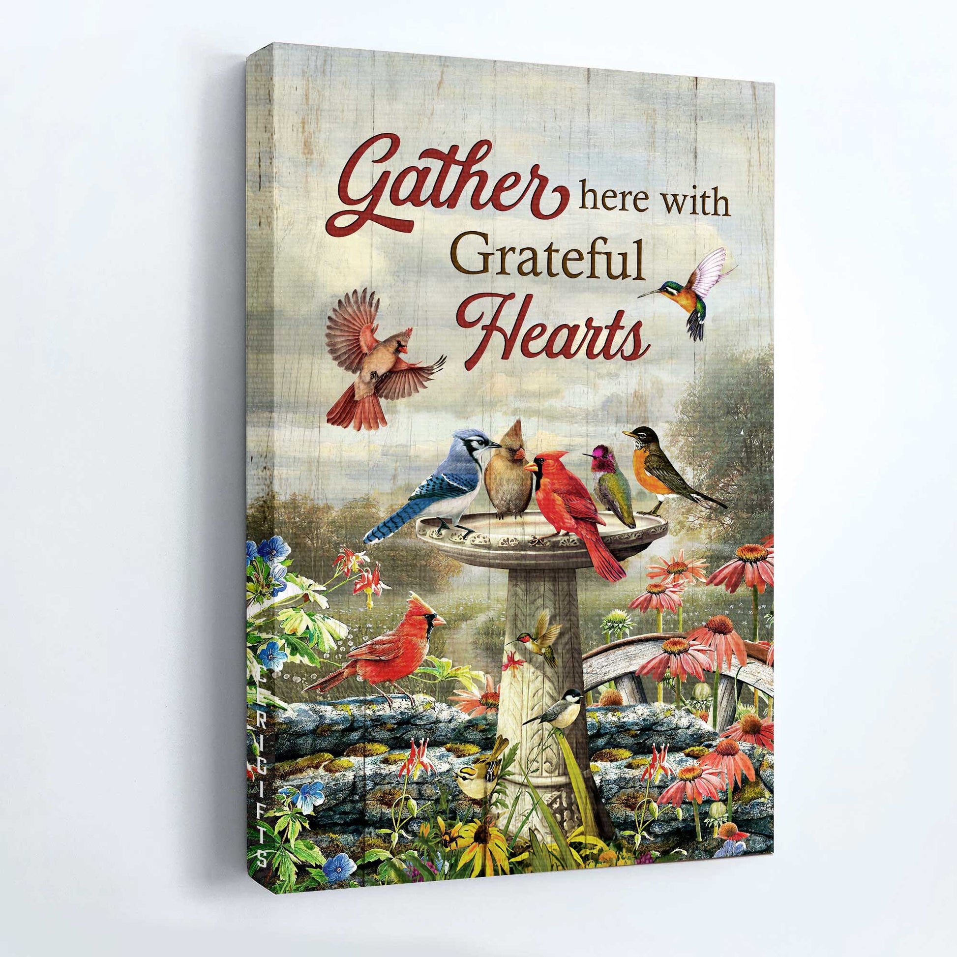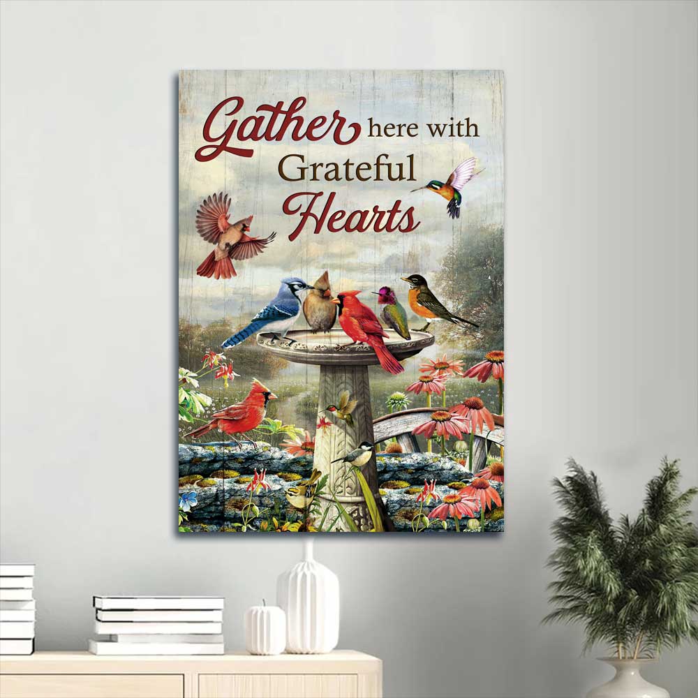 Jesus Portrait Canvas - Northern Cardinal, Hummingbirds, Rock water fountain Canvas - Gift for Christian - Gather here with grateful hearts Portrait Canvas Prints, Christian Wall Art