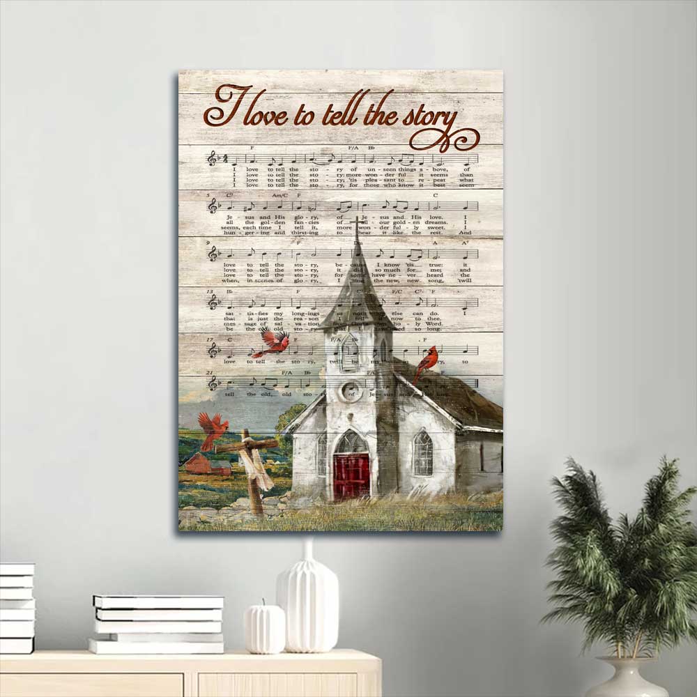 Jesus Portrait Canvas - Old church, Red cardinal, Wooden cross, Great song Portrait Canvas - Gift For Christian - I love to tell the story Portrait Canvas