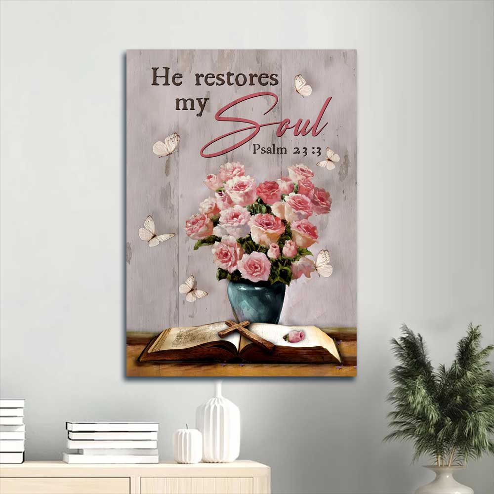 Jesus Portrait Canvas - Pink rose vase, Bible painting Portrait Canvas - Gift For Christian - He restores my soul Portrait Canvas