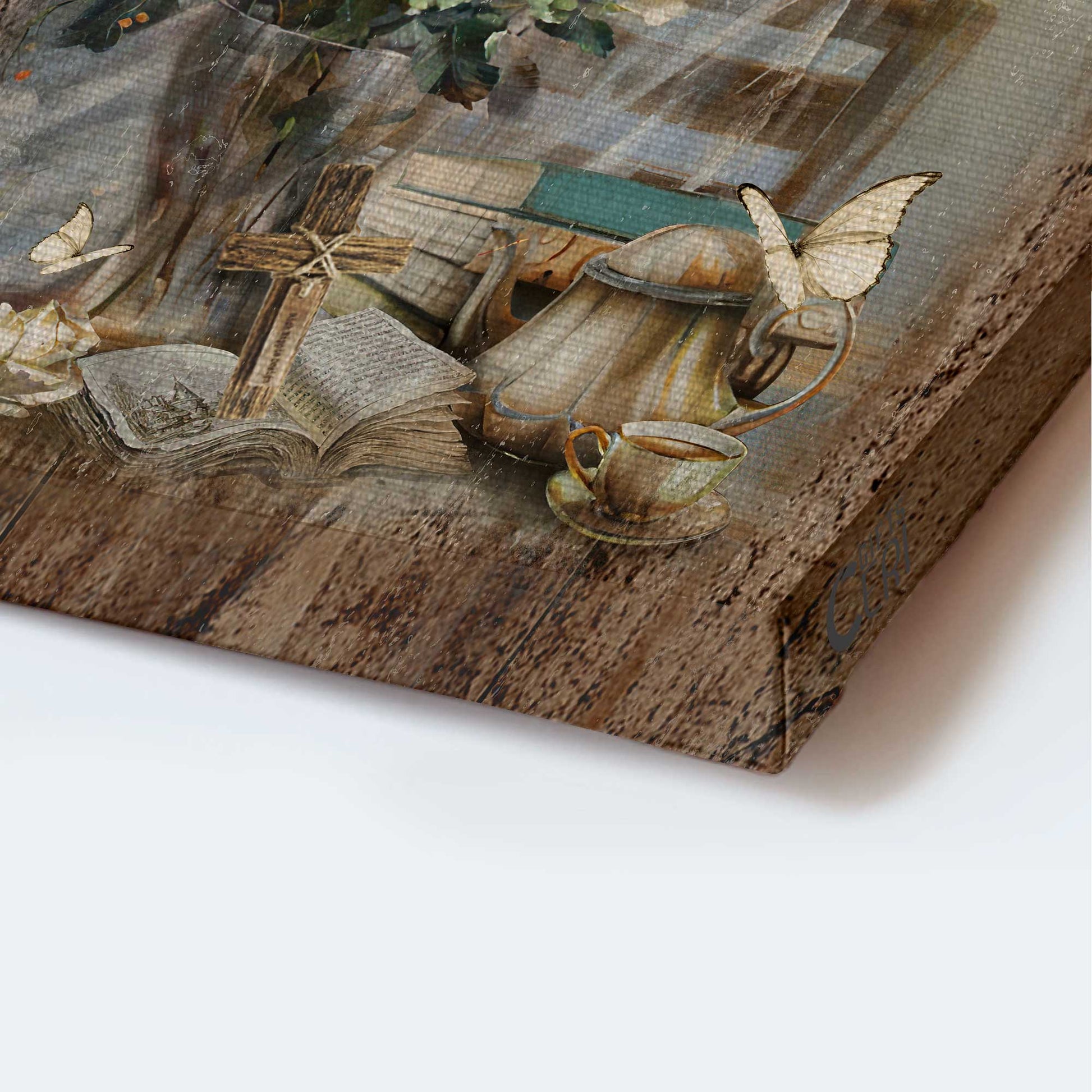 Add more serenity to your living space with our beautiful image of a pretty rose flower vase with a teapot, a wooden cross and antique books surrounded by lovely butterflies. Its subtle light color and meaningful, soothing-for-soul words will help you unwind and turn your house into a comfortable place.