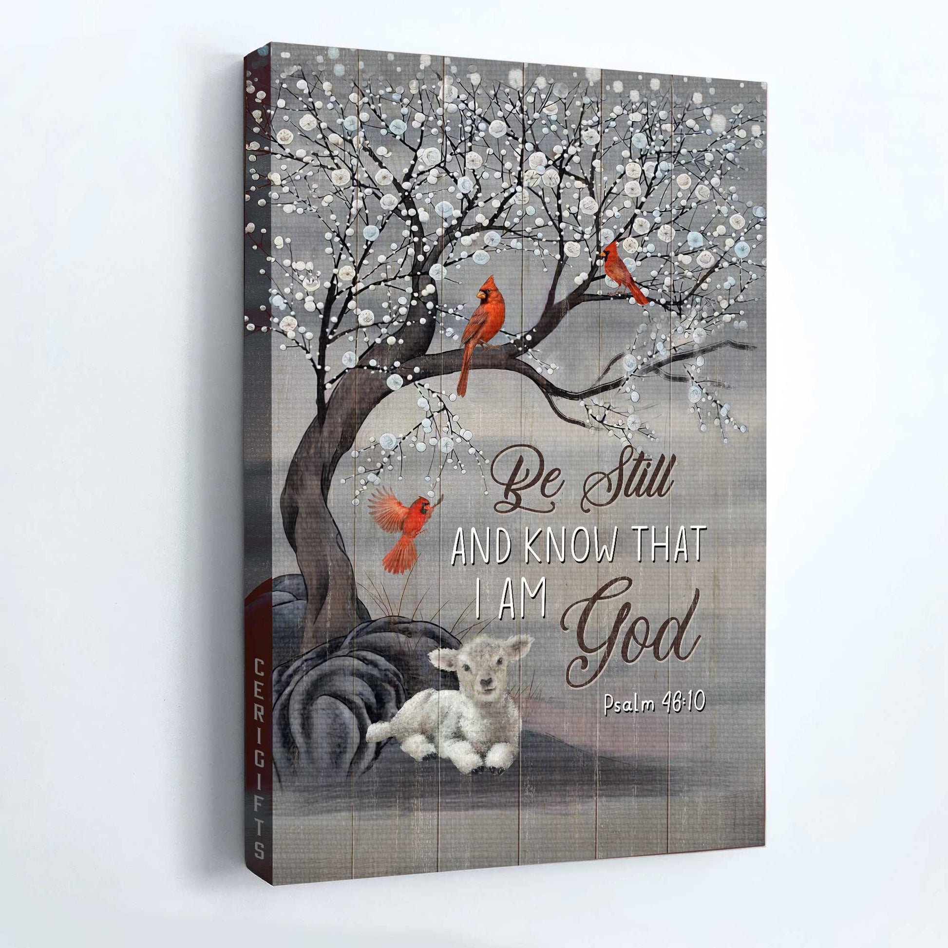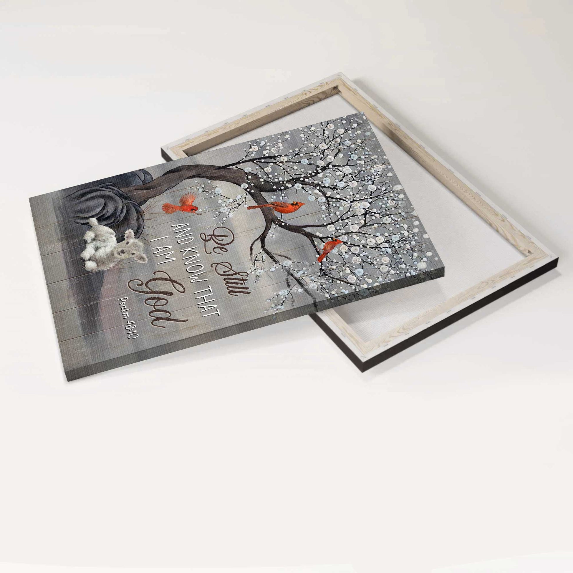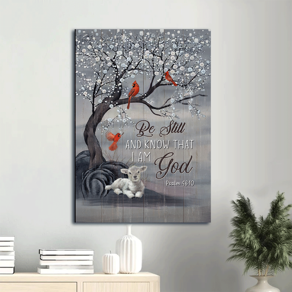 Snow tree, Red cardinal painting, White lamb- Gift for Christian- Be still and know that I am God - Portrait Canvas Prints, Wall Art can be hung on the wall of your kitchen, living room, bedroom, bathroom and even outdoor space.
