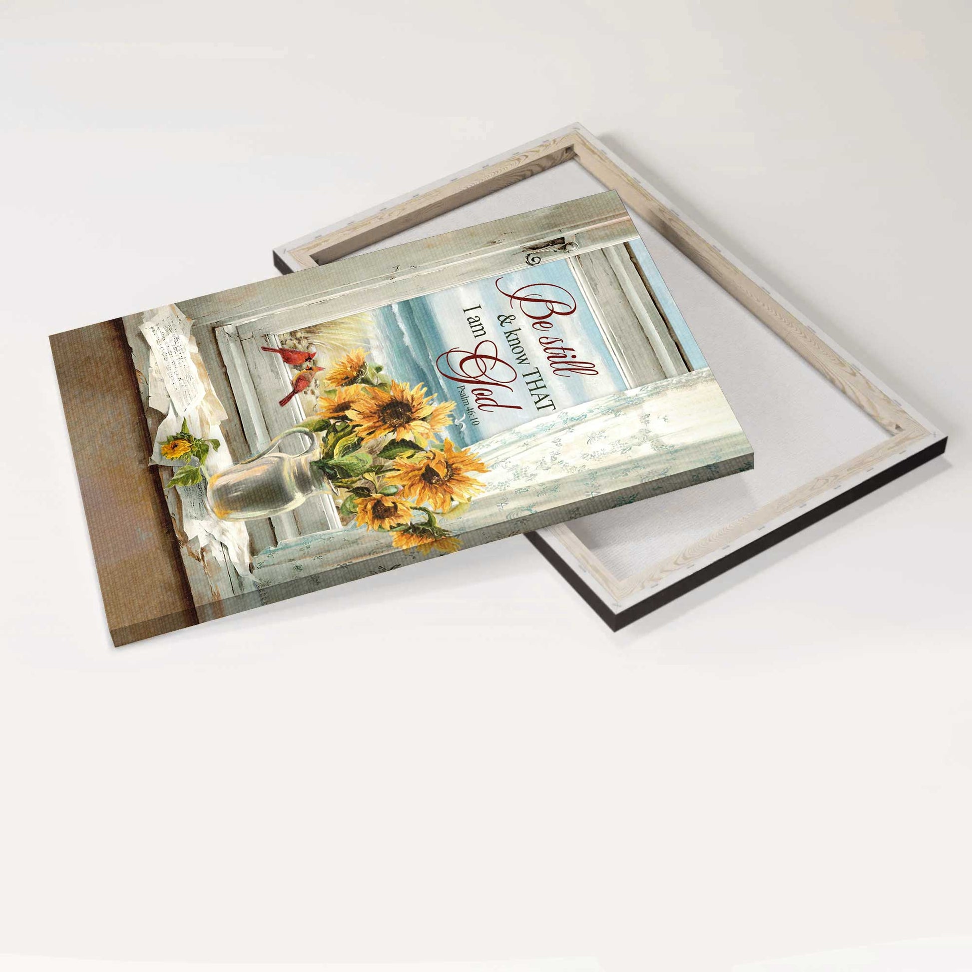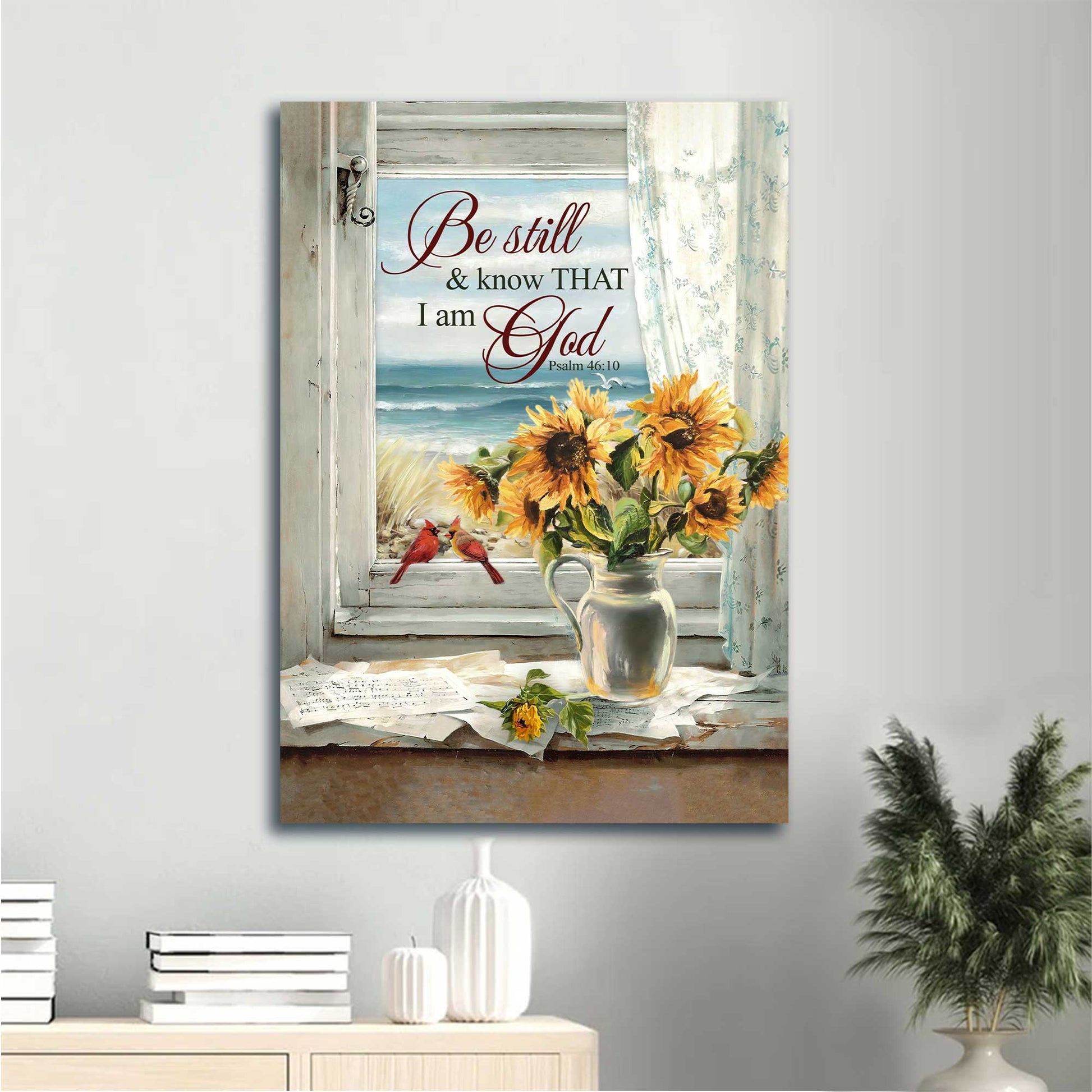 The image of the sunflower vase with the cardinal couple and meaningful quotes of this amazing Jesus Portrait Canvas - Sunflower Painting, Vintage Window, Beautiful Beach Canvas - Gift For Christian - Be Still And Know That I Am God Canvas Prints, Wall Art will definitely be a meaningful gift not only for your friend but also for your lover and your family. This wonderful canvas will be suitable for any room in your house from the kitchen, bedroom, and living room to outside space.