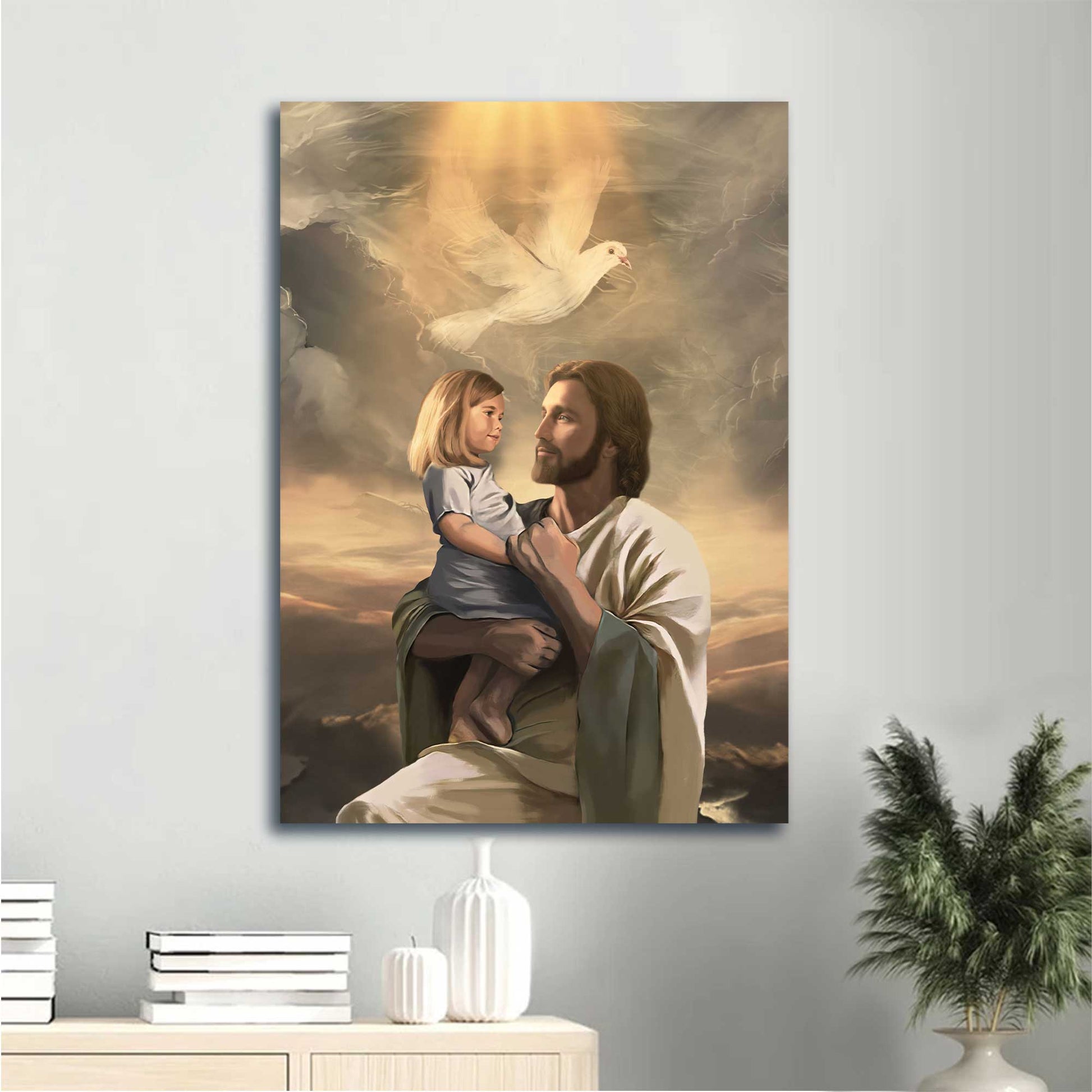 The image of Jesus with child, white dove Jesus Portrait Canvas - The Life Of Jesus, White Dove, Jesus Painting, Jesus With Child Canvas - Gift For Christian Canvas Prints, Wall Art will definitely be a meaningful gift not only for your friend but also for your lover and your family. This wonderful canvas will be suitable for any room in your house from the kitchen, bedroom, and living room to outside space.