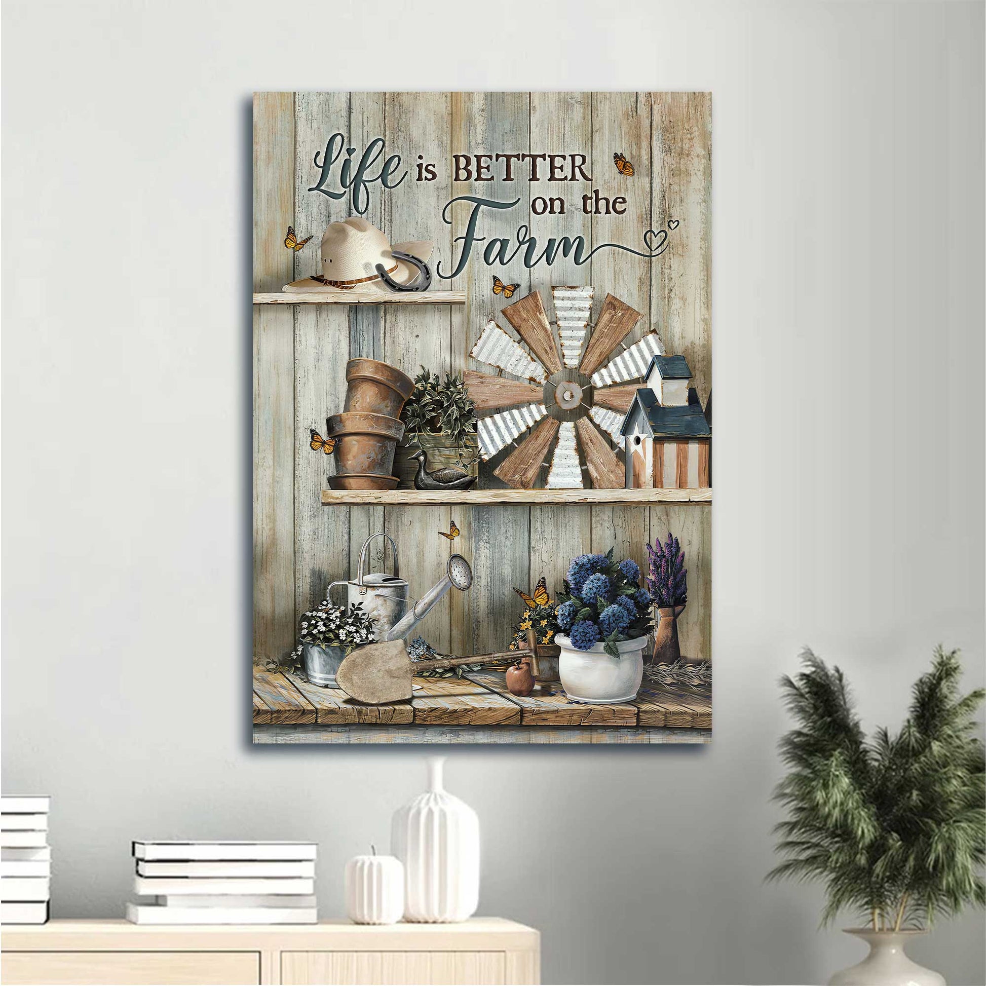 Add more serenity to your living space with our beautiful image of a windmill and a blue hydrangea flower vase in a vintage garden surrounded by lovely butterflies. Its subtle light color and meaningful, soothing-for-soul words will help you unwind and turn your house into a comfortable place.