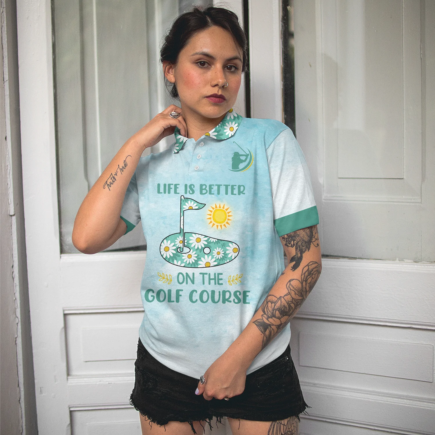 Light Blue Tie Dye Daisy Floral Golf Course Women Polo Shirt, Life Is Better On The Golf Course Golf Girl Short Sleeve Shirt For Ladies