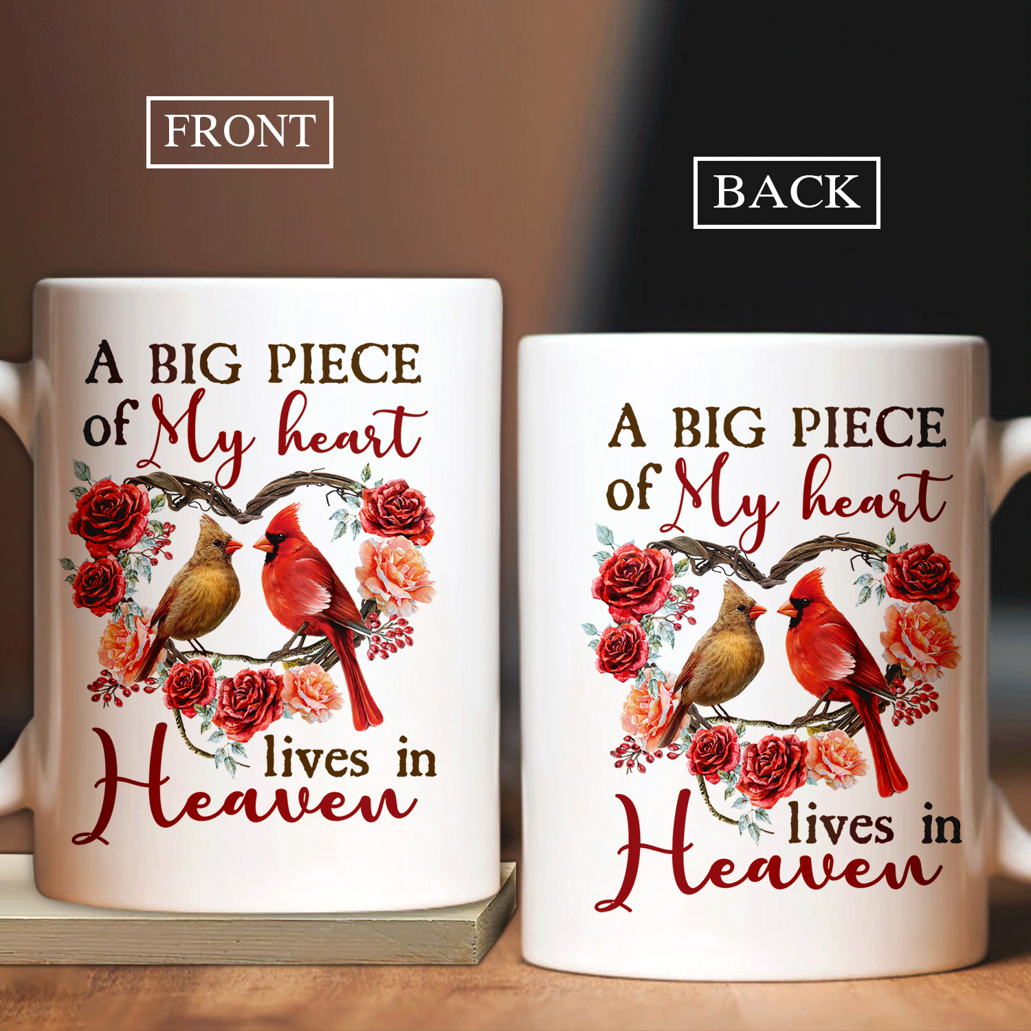 Memorial AOP Mug - Cardinal couple, Rose flower wreath- Gift For Member Family - A big piece of my heart lives in heaven - Heaven AOP Mug