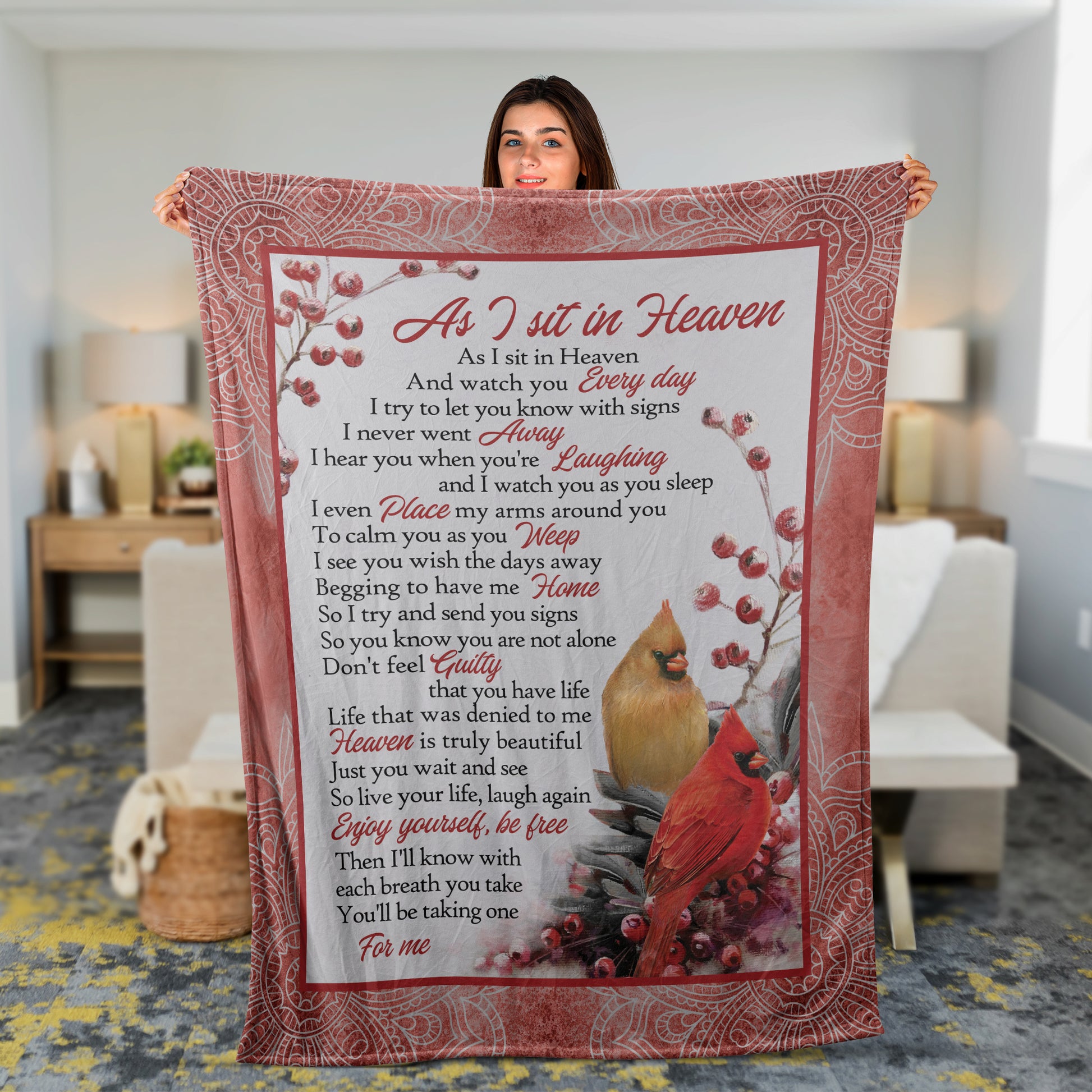 Memorial Blanket, Heaven Blanket, Cardinal Couple Blanket, Sympathy Gift, Remembrance Gift - Cranberry, Love Message, As I Sit In Heaven