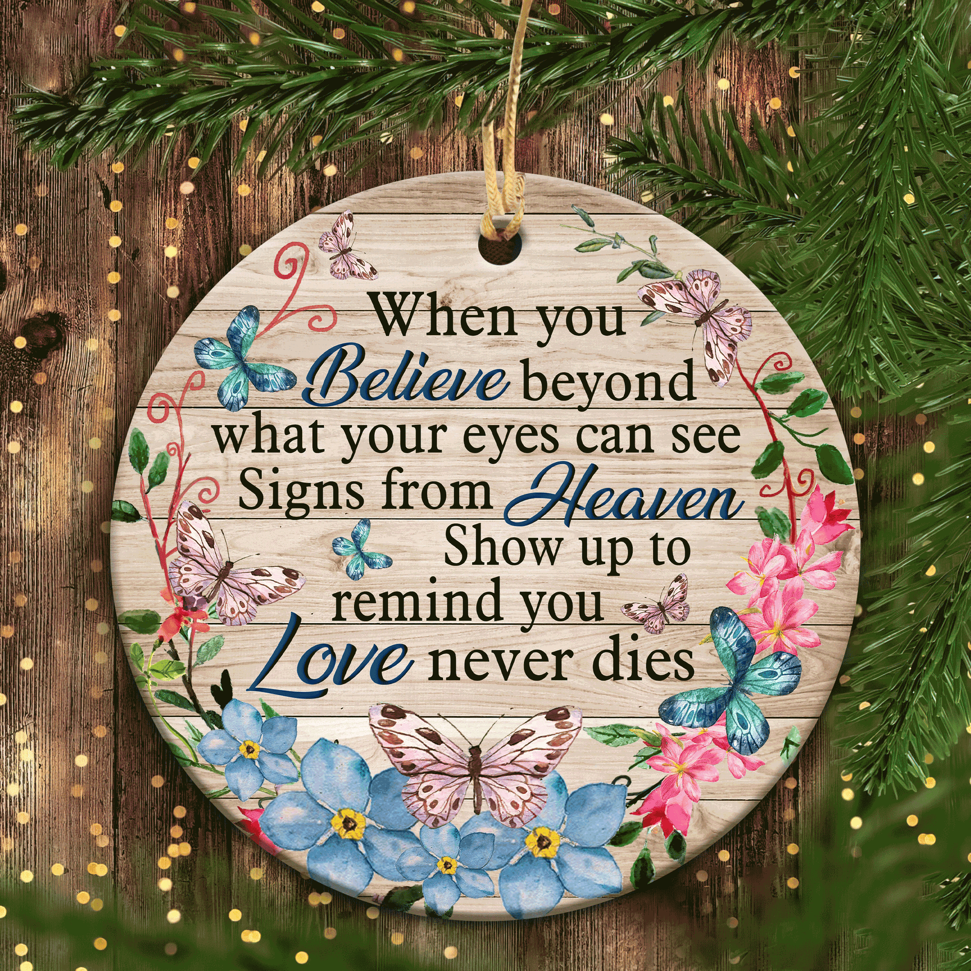 Memorial Circle Ceramic Ornament- Heaven, Colorful Flowers, Pretty Butterfly- Gift For Members Family- When You Believe Beyond.