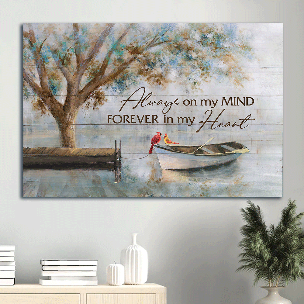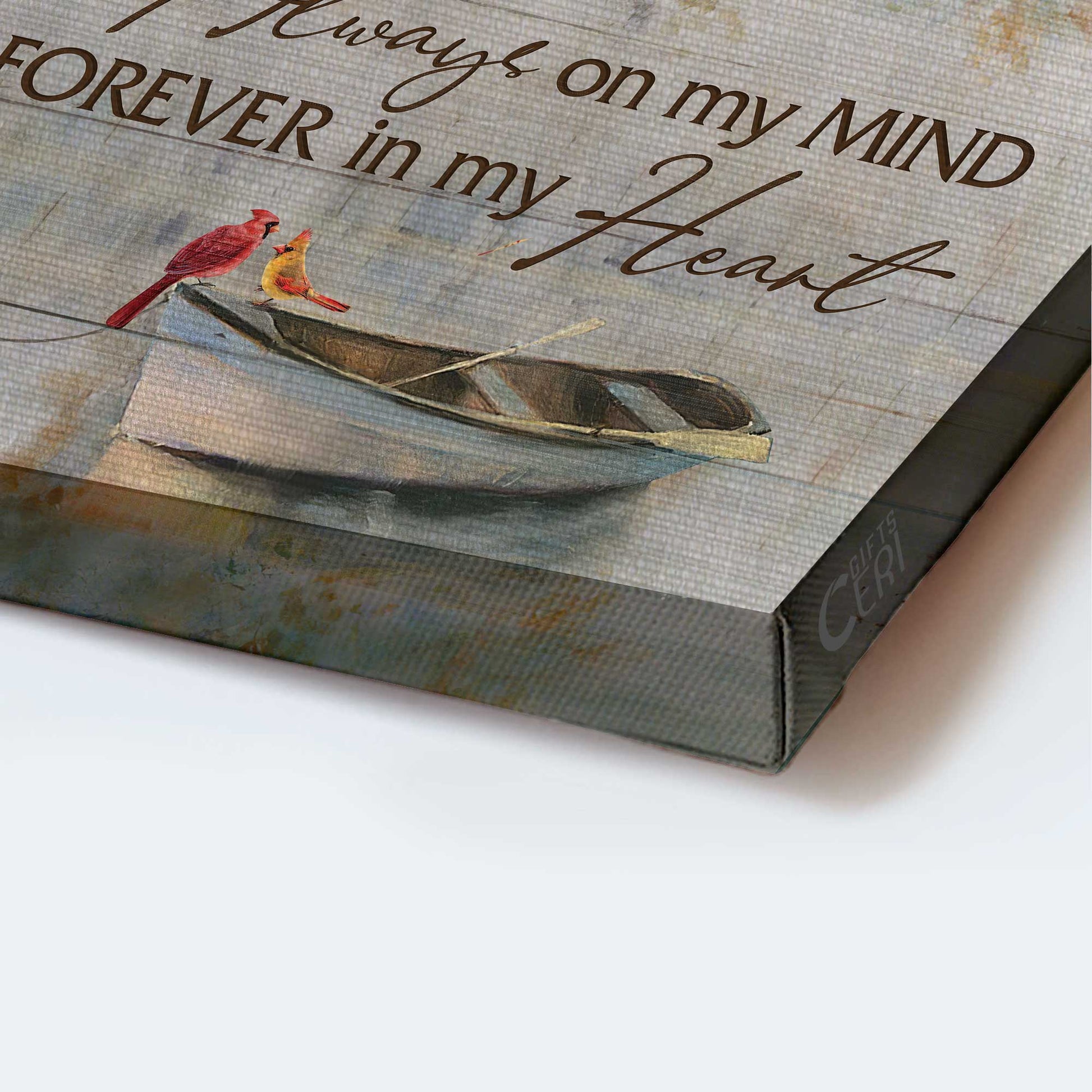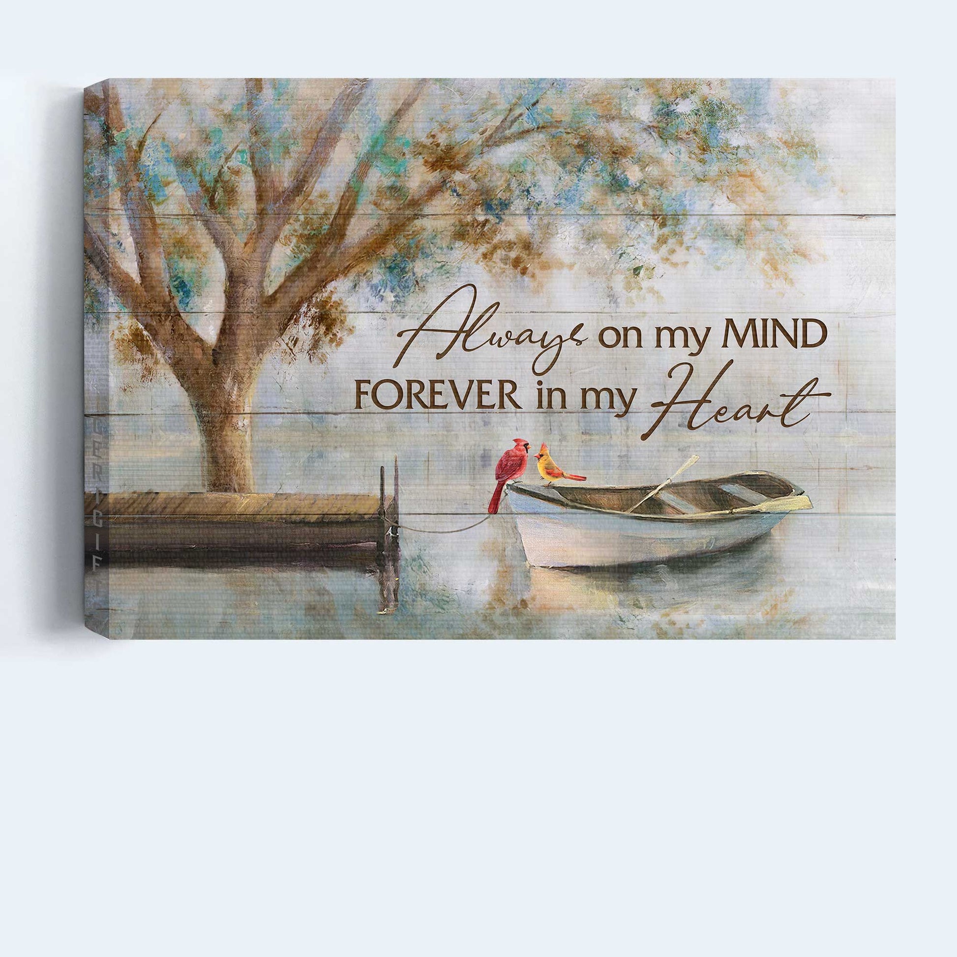 Memorial Landscape Canvas- Beautiful lake, Watercolor cardinal, Boat painting canvas- Gift for members family- Always on my mind, Forever in my heart.