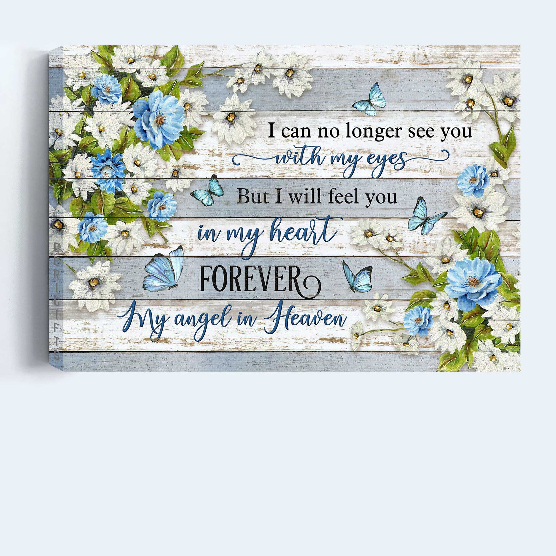 Memorial Landscape Canvas - Flower painting, Blue butterfly- Gift for Family- I will feel you in my heart forever - Heaven Landscape Canvas Prints, Wall Art can be hung on the wall of your kitchen, living room, bedroom, bathroom, and even outdoor space.