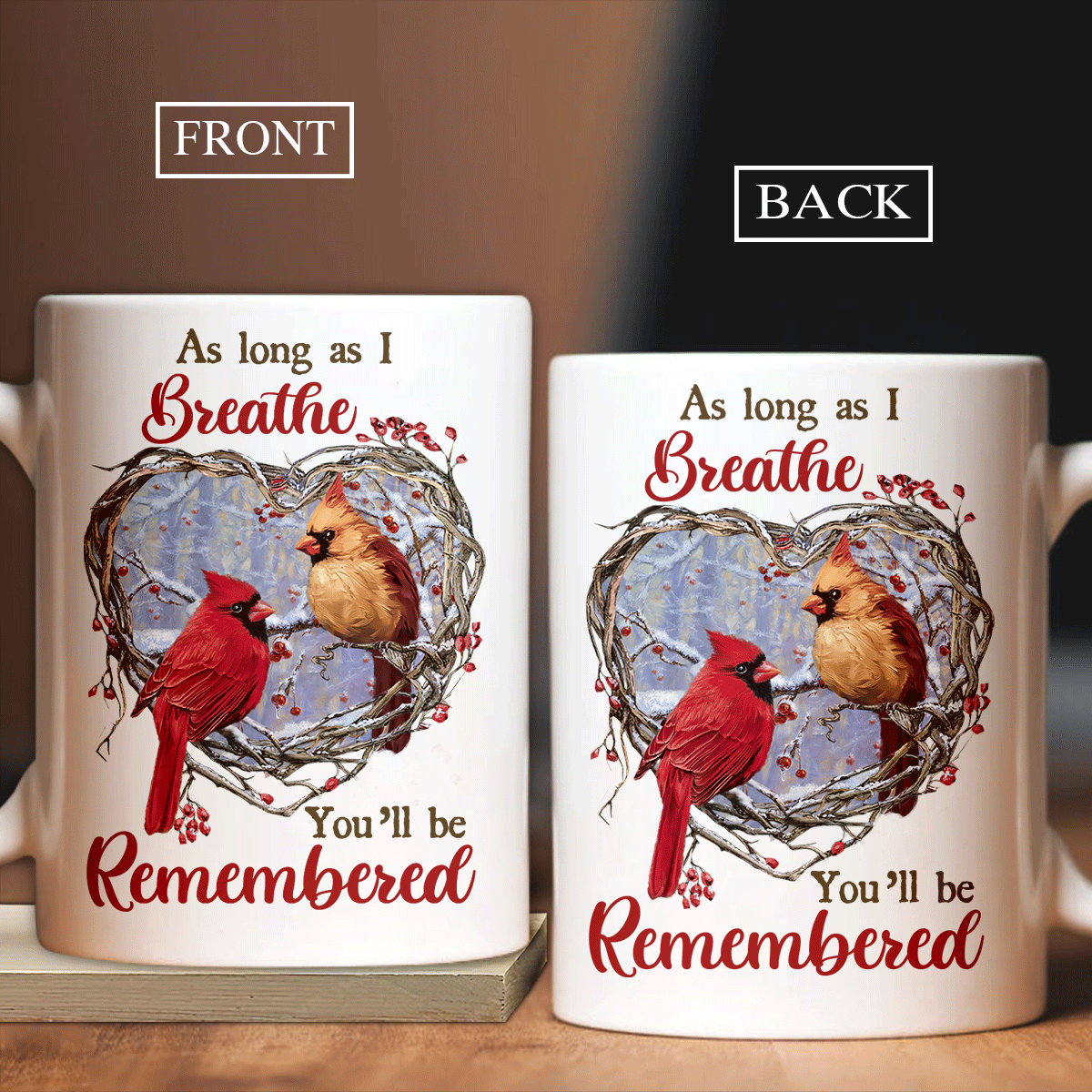 Memorial White Mug - Cardinal painting, Cranberry wreath, Heart shape - Gift for members family - As long as I breathe, You'll be remembered - Heaven White Mug.