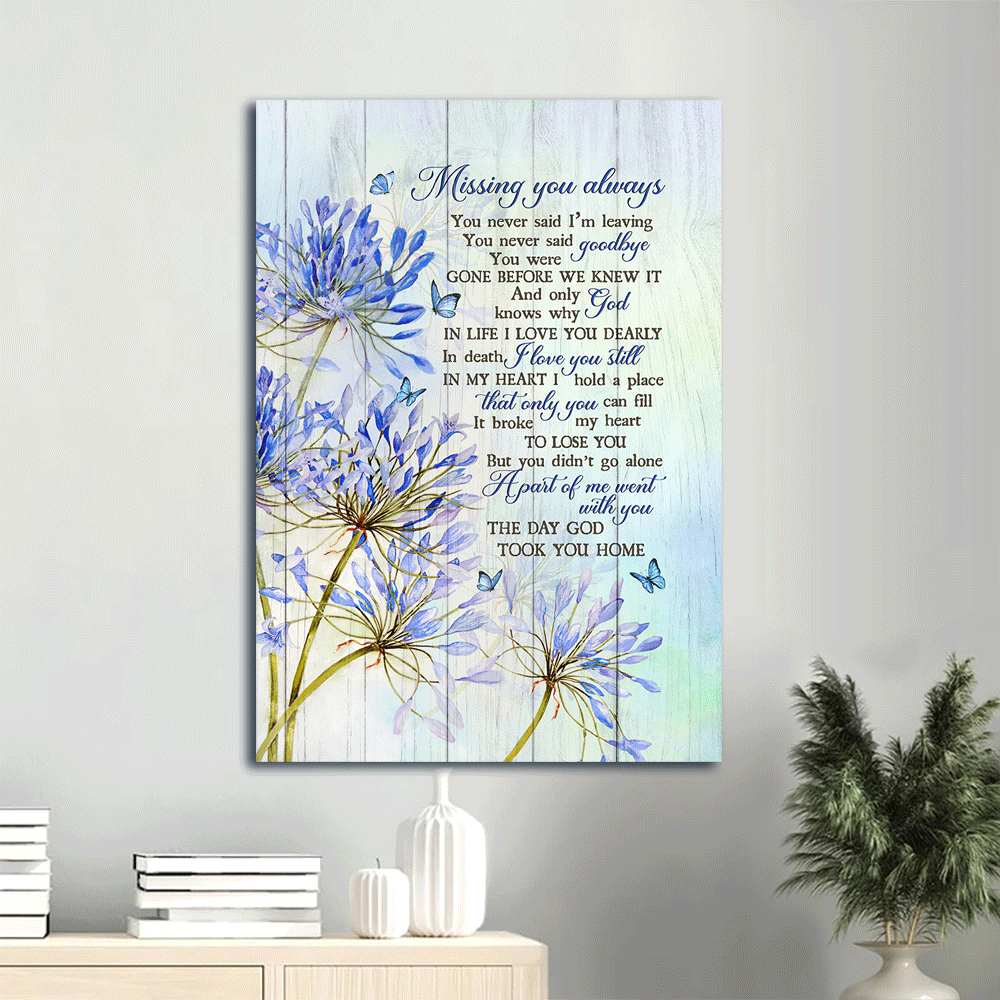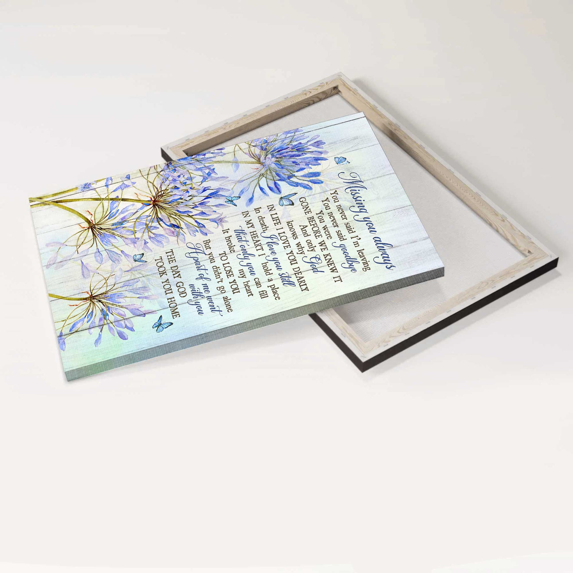 Losing someone is the hardest thing in life, especially when it’s the person you love most. We fully feel for it, and get willing to share your sadness from the bottom of our hearts. With a rustic background, fragile butterflies, blue flowers and the texture "The day God took you home", Memorial Portrait Canvas- Agapanthus Africanus, Purple Butterfly, Heaven Portrait Canvas- Gifts For Butterfly Lover- Gifts For Members Family- Missing You Always will bring a sense of peace to your soul. Memorial Portrait Canvas- Agapanthus Africanus, Purple Butterfly, Heaven Portrait Canvas- Gifts For Butterfly Lover- Gifts For Members Family- Missing You Always can be hung on the wall of your living room, bedroom, and hallway.