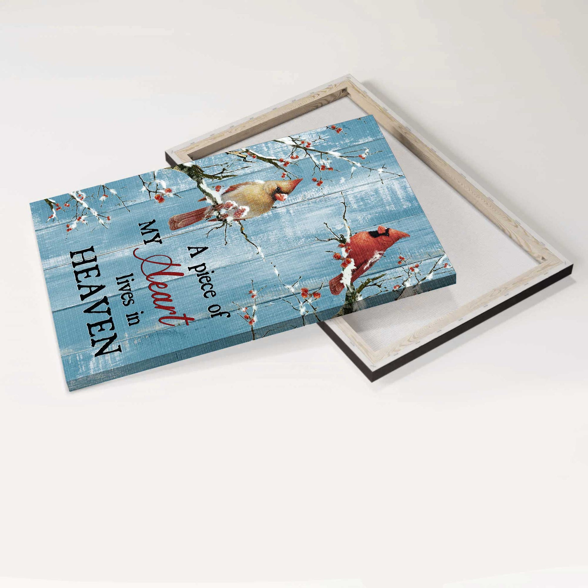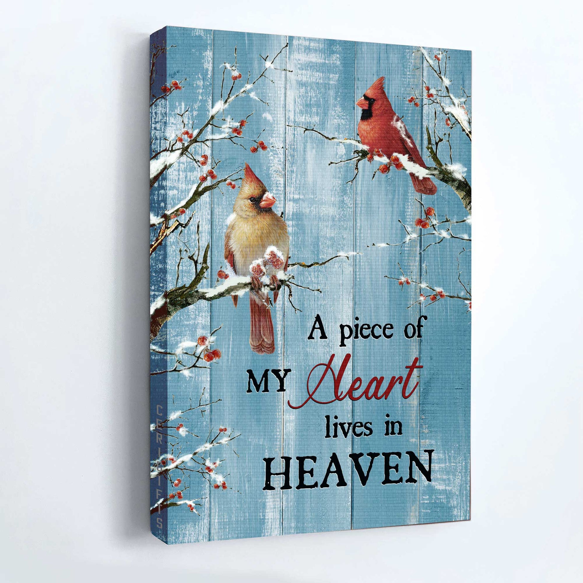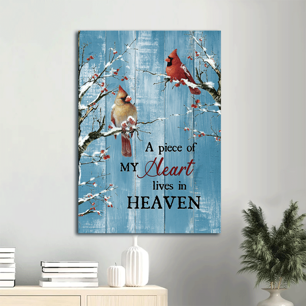 Memorial Portrait Canvas- Blue background, Cardinal, Frozen cranberry - Gift for family- A piece of my heart lives in heaven - Heaven Portrait Canvas Prints, Wall Art