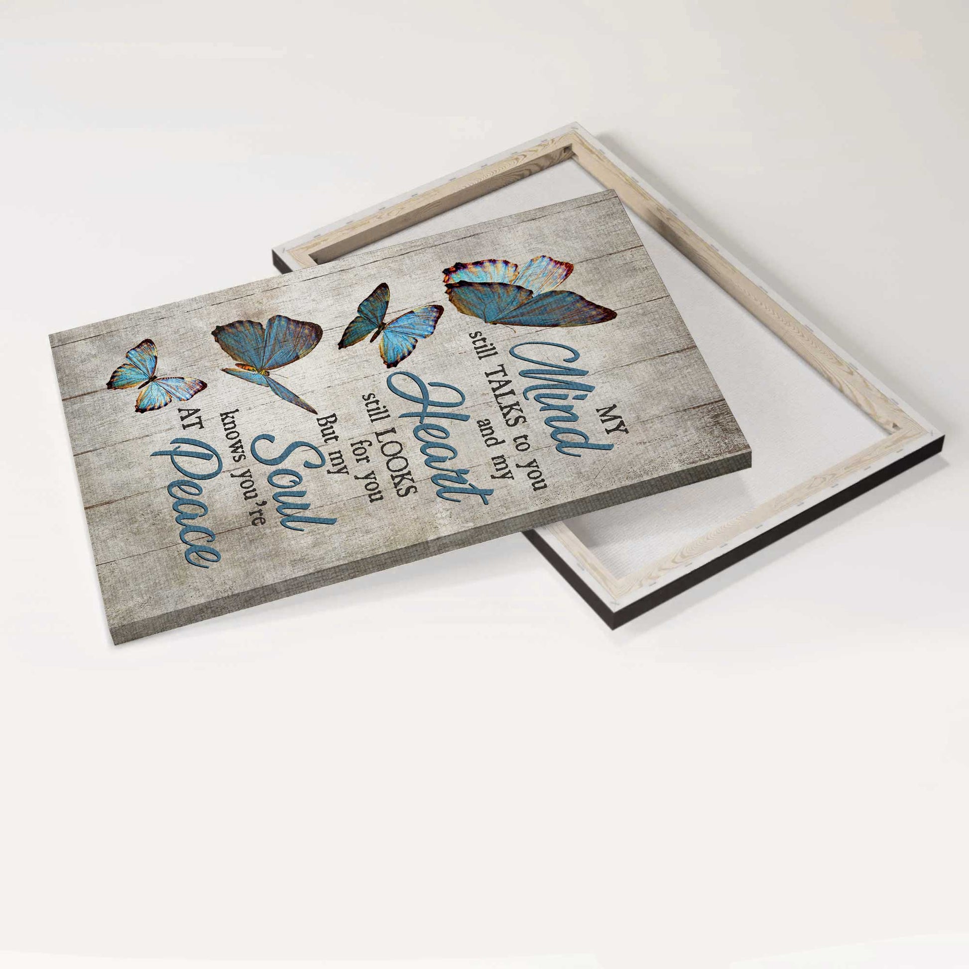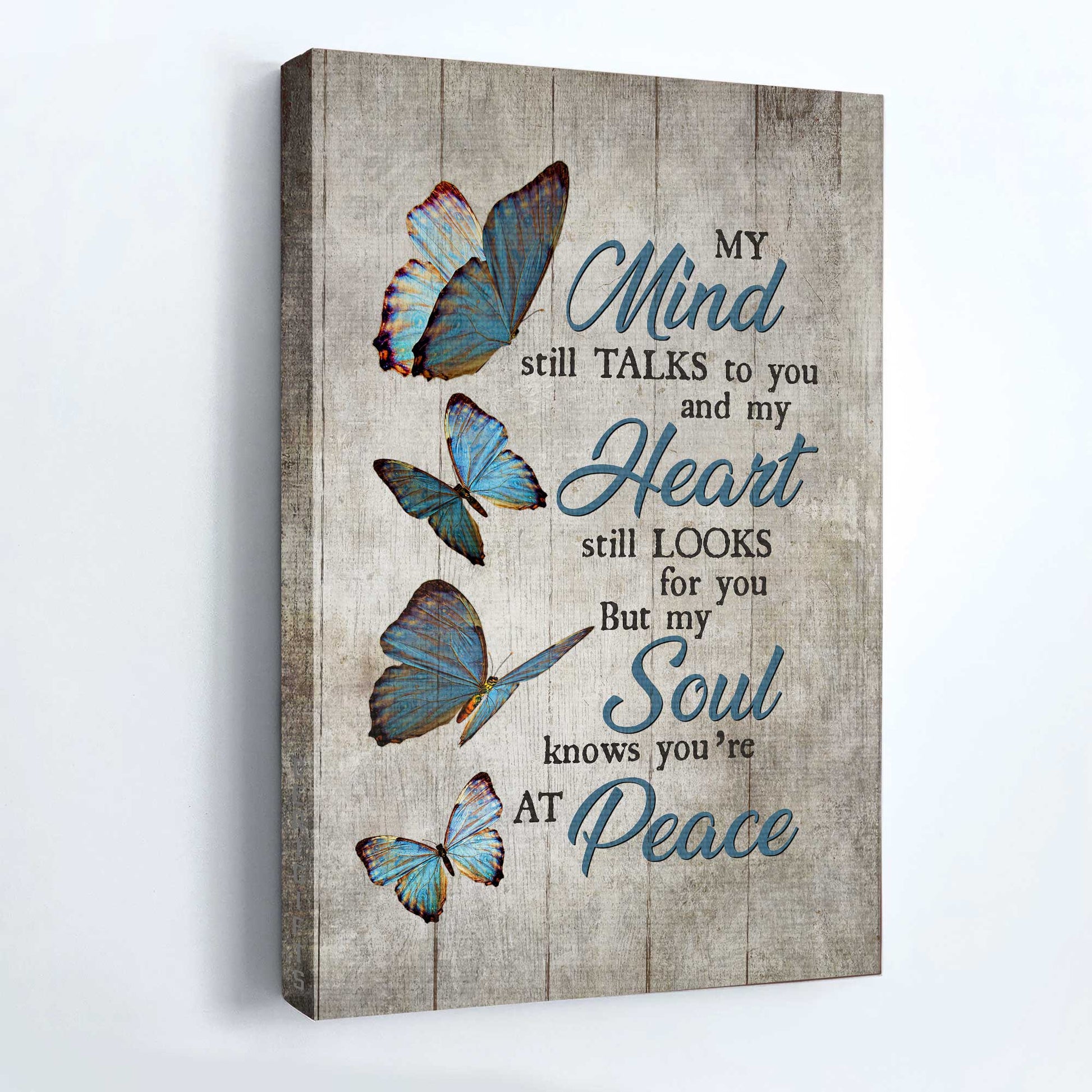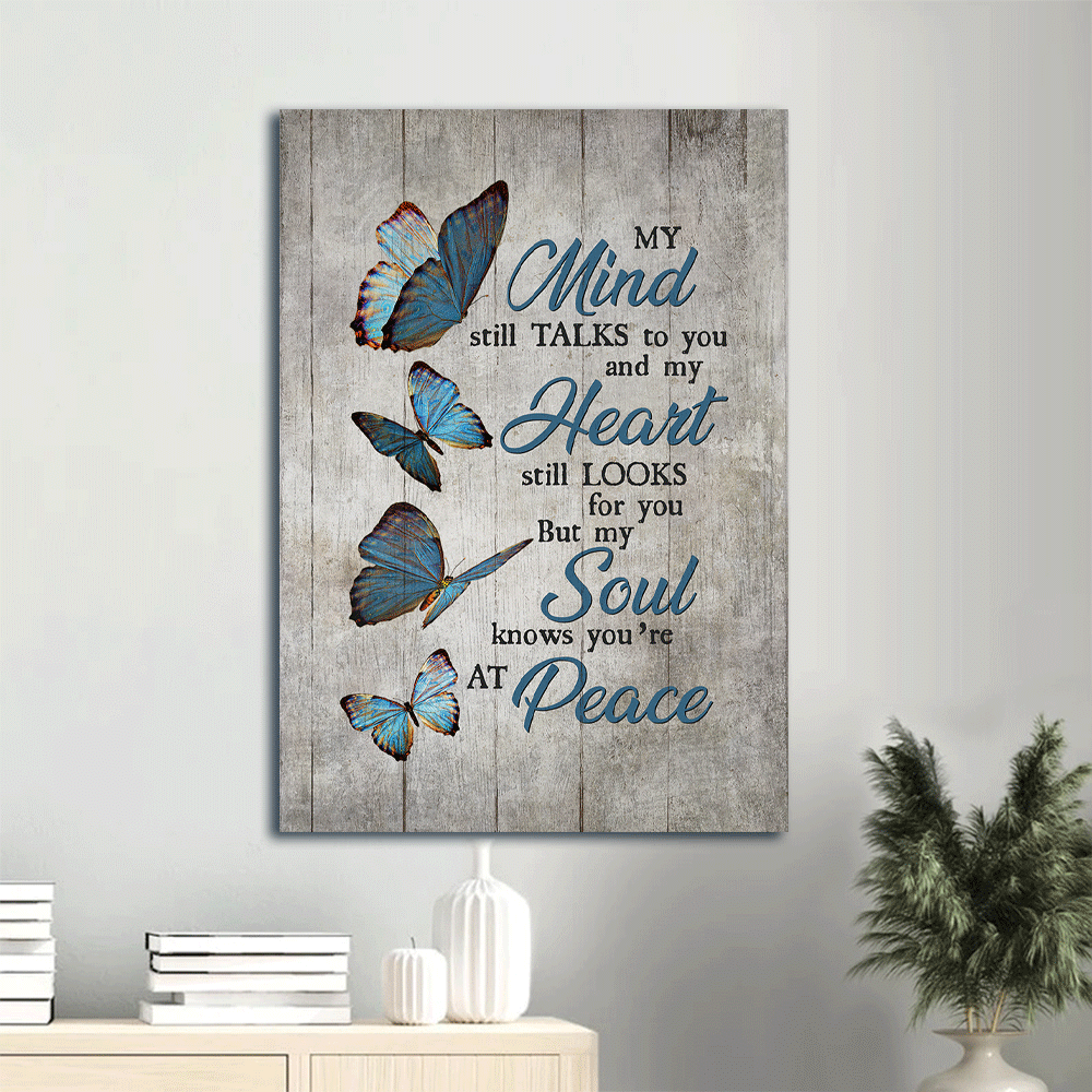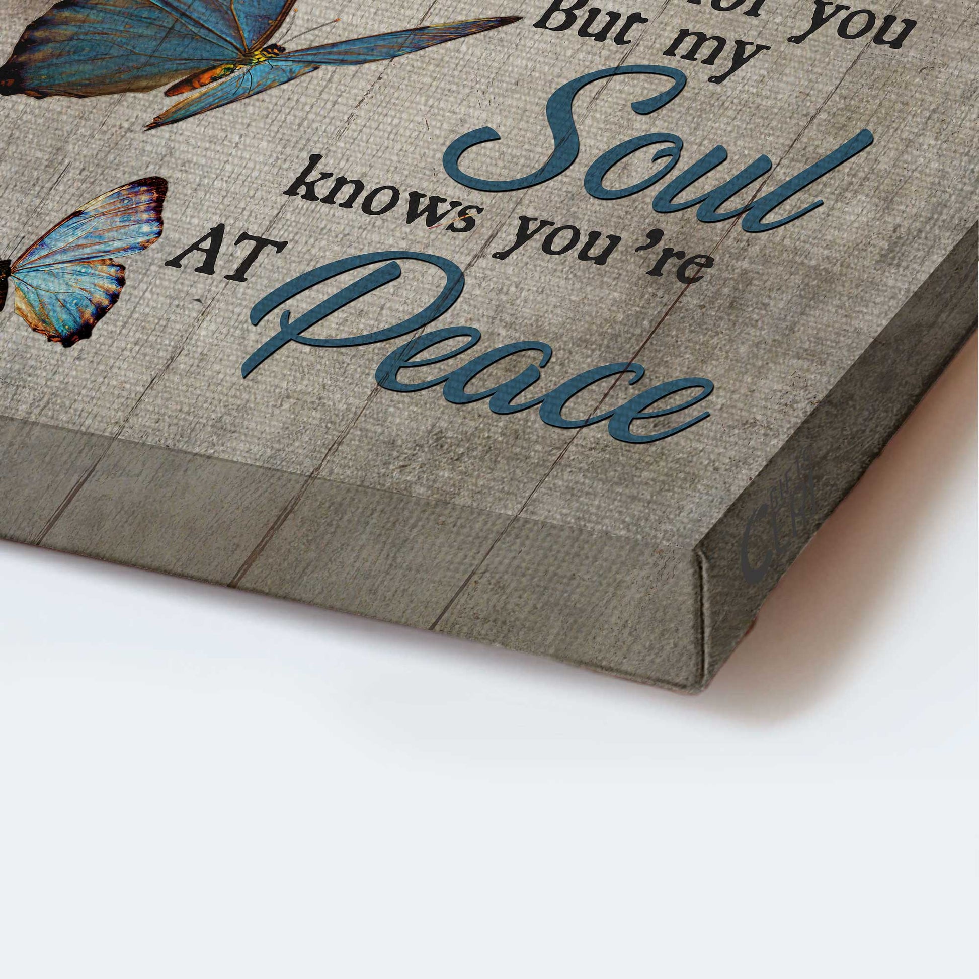 Expressing your emotion to your mom who has gone with our Memorial Portrait Canvas- Blue butterfly, Grey background canvas- Gift for members family- You are at peace - Heaven Portrait Canvas Prints, Wall Art. This pretty butterflies is a reminder for you that even though the person you loved is gone, your heart is still with them in heaven. Furthermore, a grey background with meaningful quote will serve as a comforting presence in your house and help you feel peace. Hope our Memorial Portrait Canvas- Blue butterfly, Grey background canvas- Gift for members family- You are at peace - Heaven Portrait Canvas Prints, Wall Art will bring the presence of the deceased to ease your nostalgia.