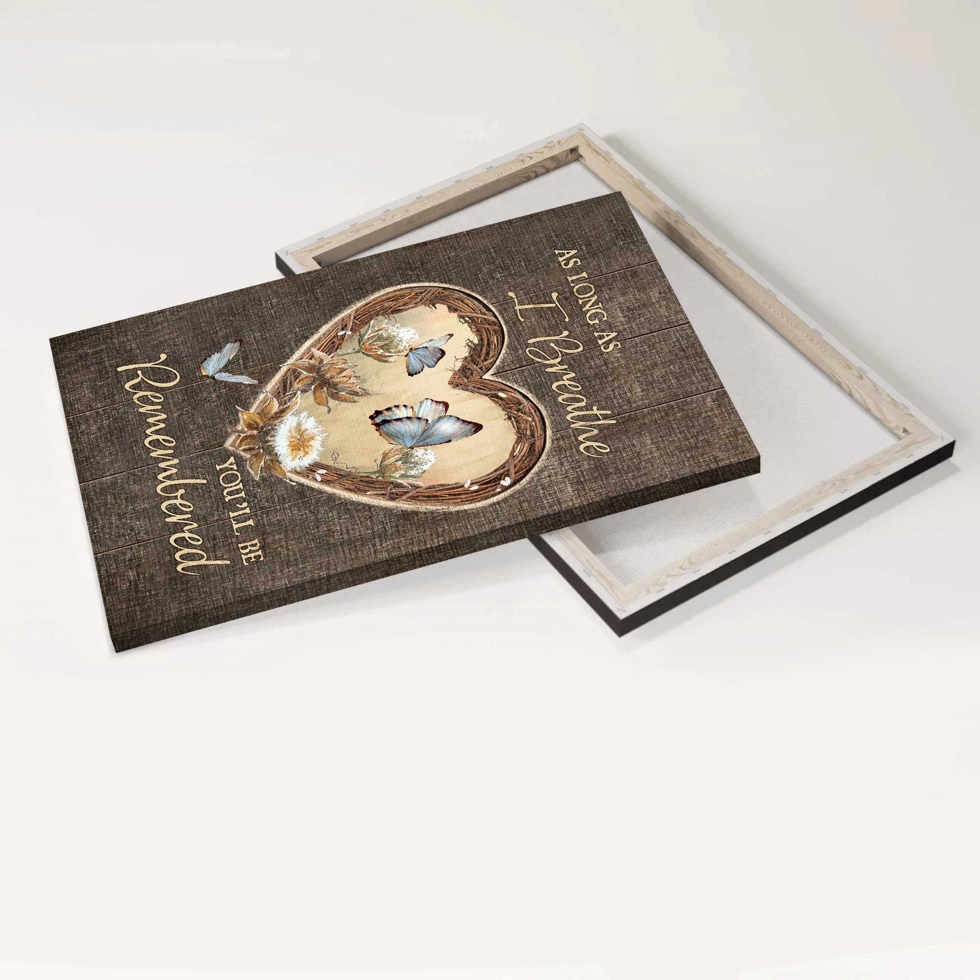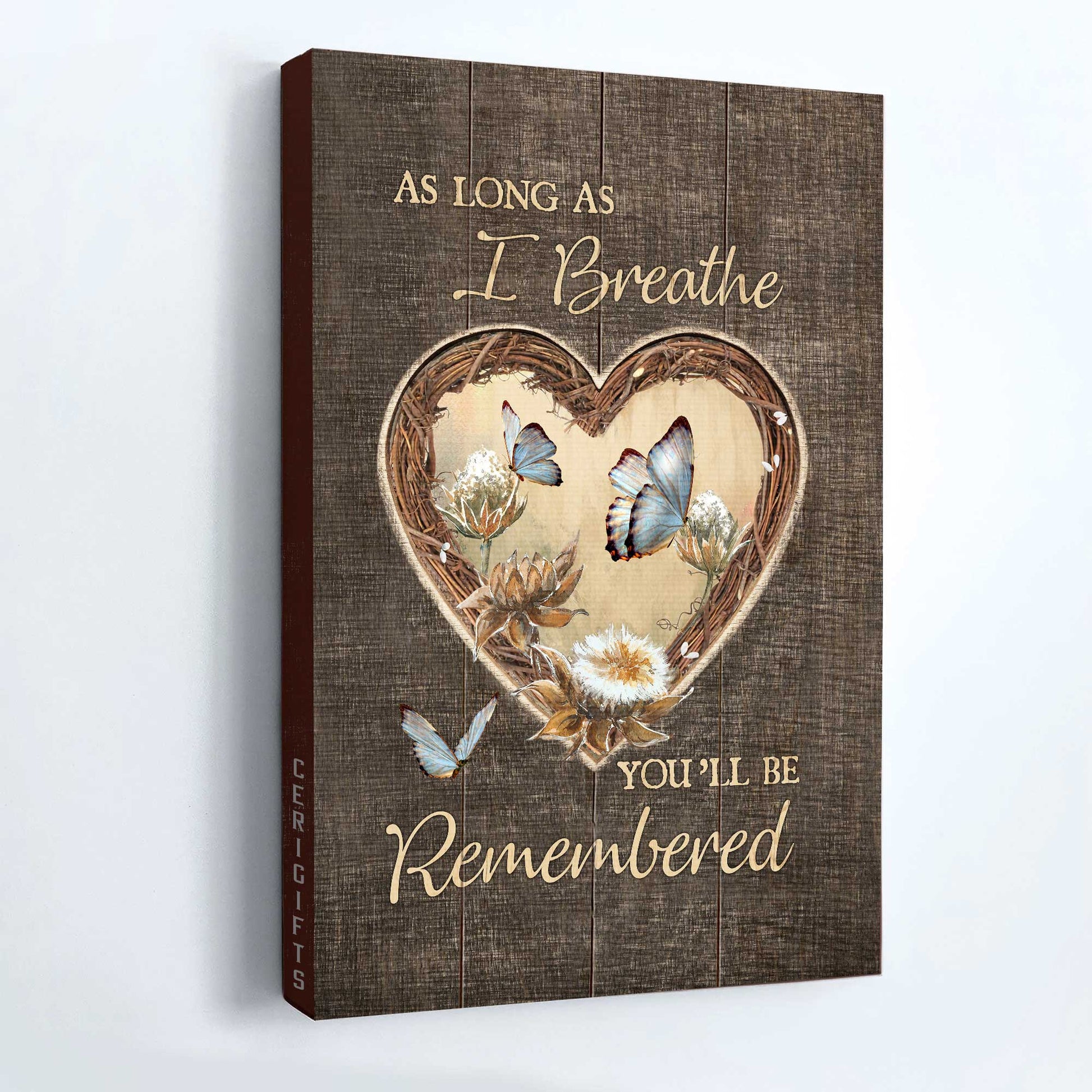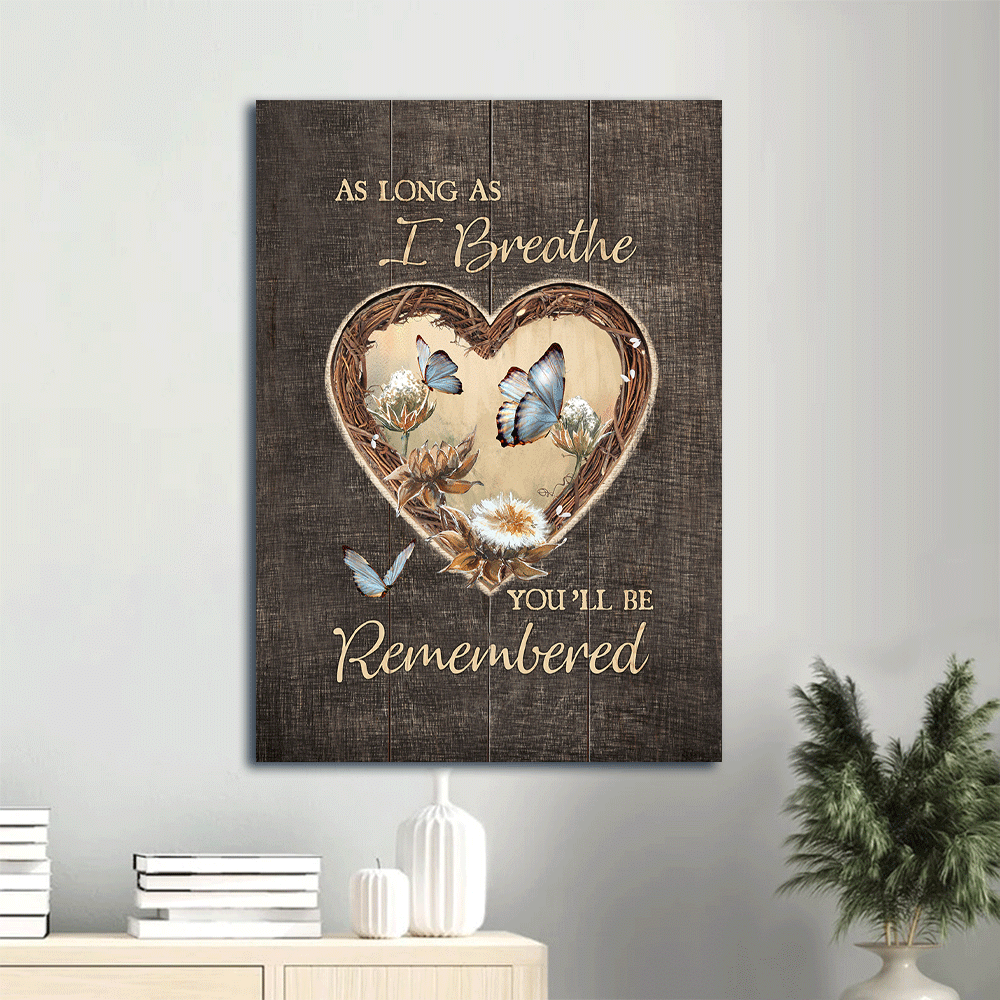 Memorial Portrait Canvas- Blue butterfly, Heart wreath, Pretty wildflower canvas- Gift for members family- As long as I breathe, you'll be remembered - Heaven Portrait Canvas Prints, Wall Art