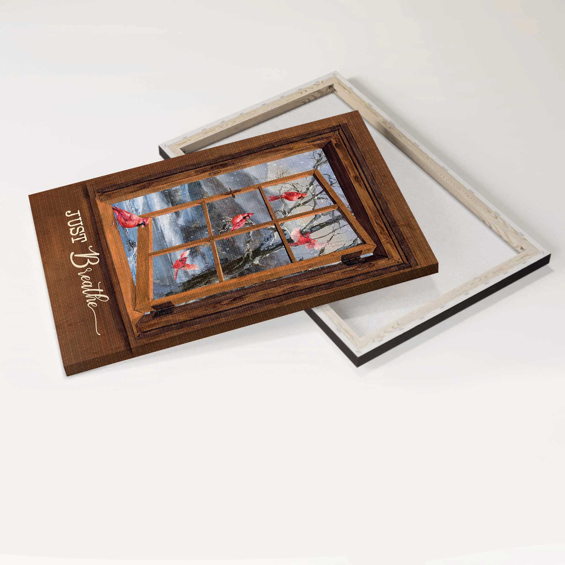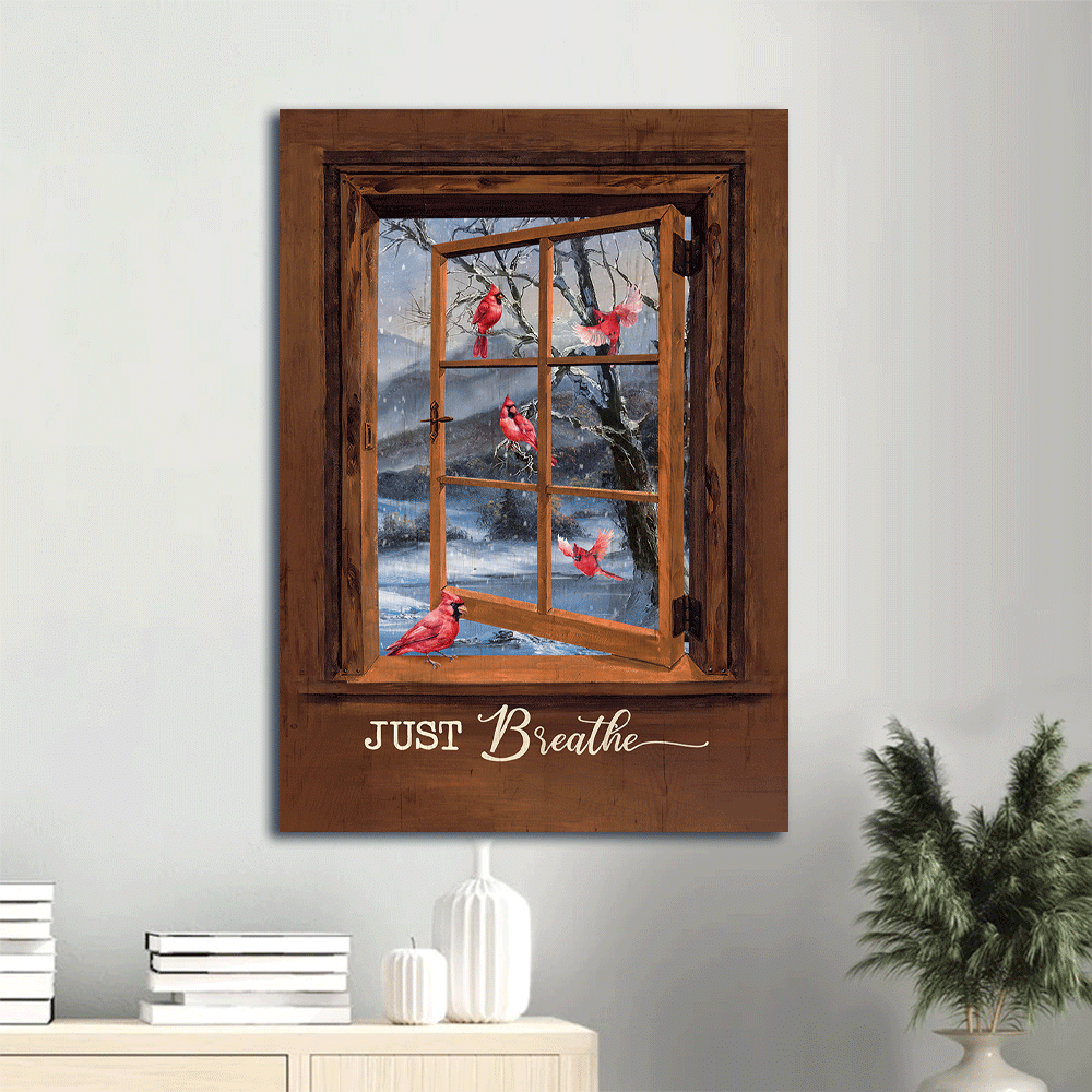 Memorial Portrait Canvas- Blue night, Red cardinal drawing, Wooden window, White snow, Just breathe - Gift for members family- Heaven Portrait Canvas Prints, Wall Art