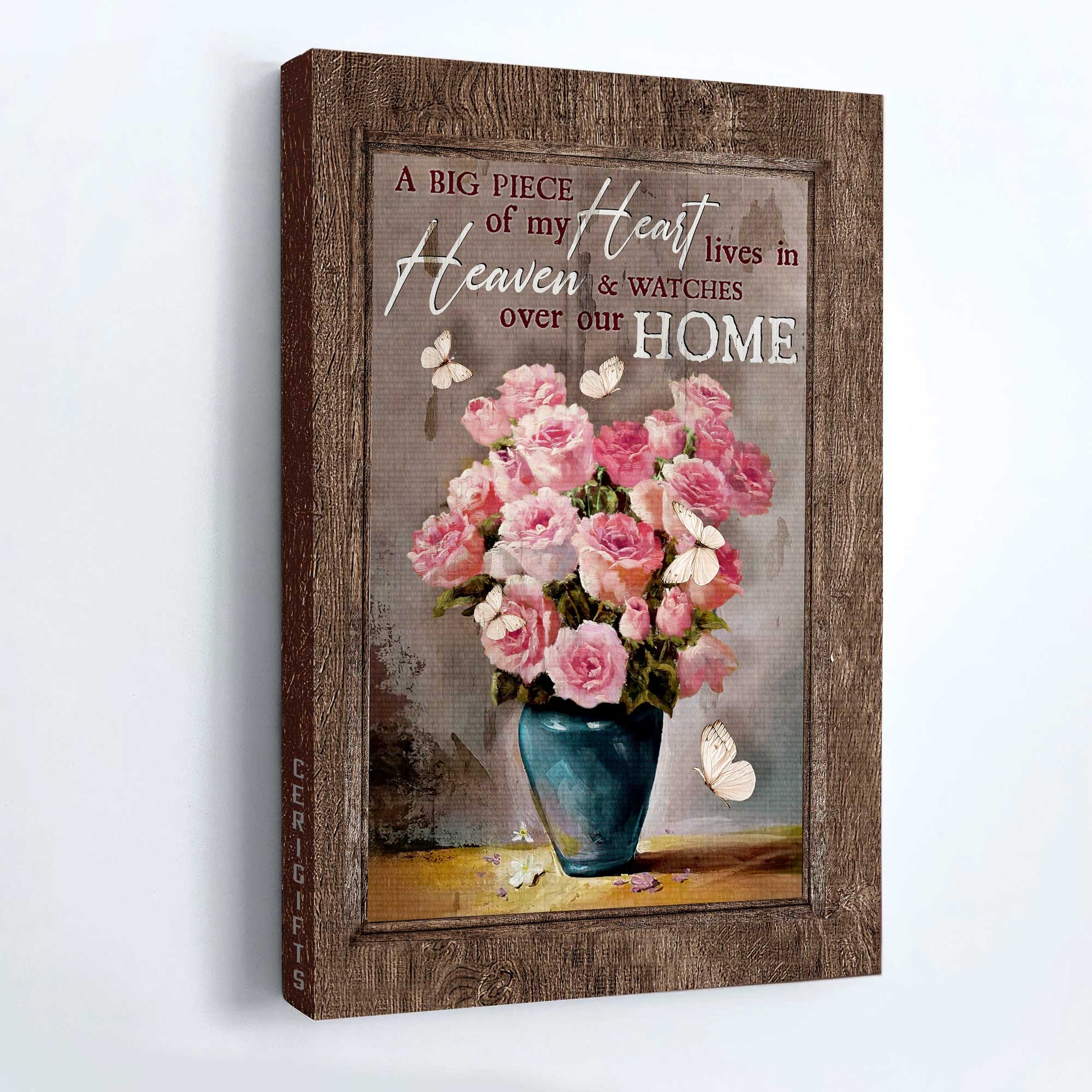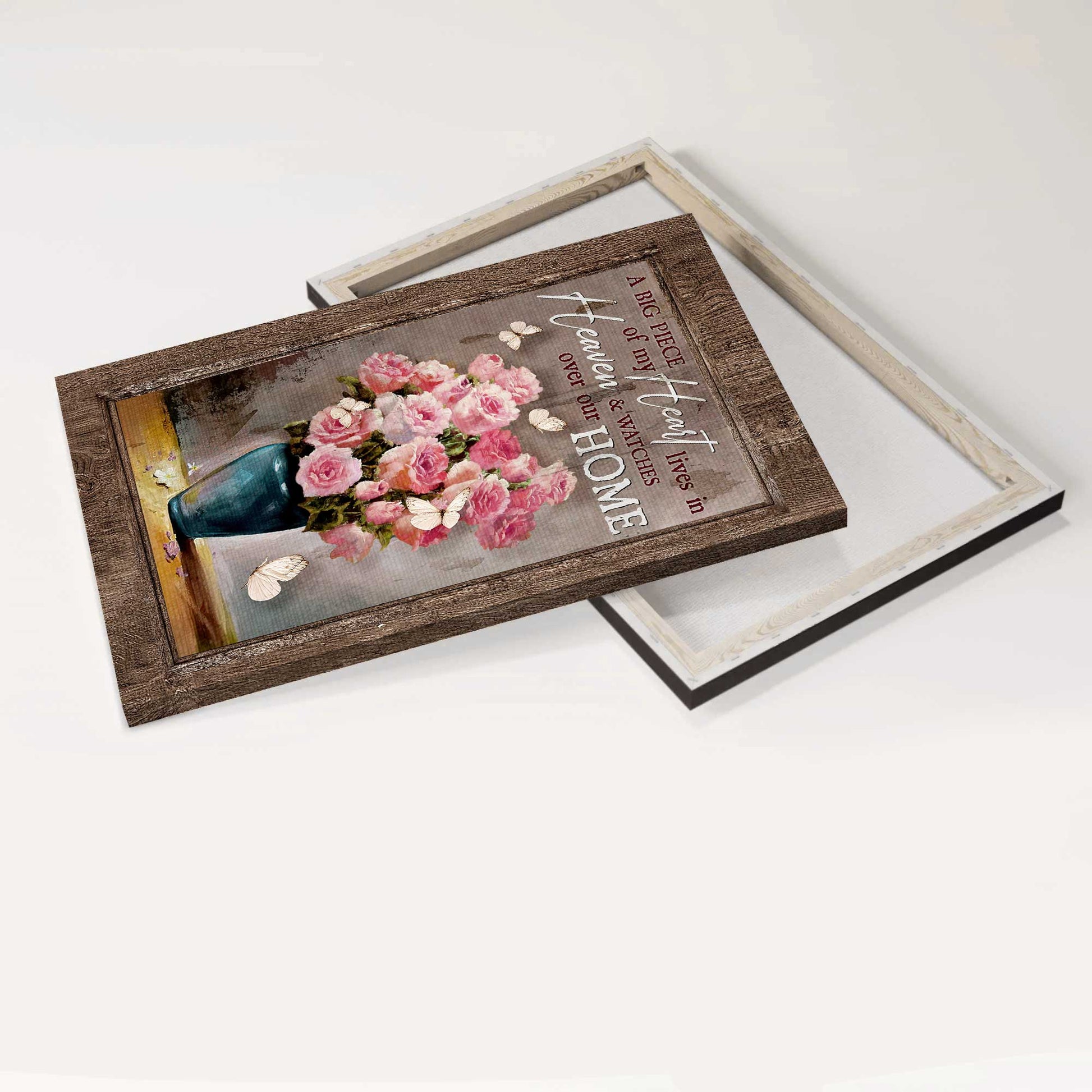 Memorial Portrait Canvas- Brilliant pink rose vase, Still life painting, Butterfly canvas- Gift for members family- A big piece of my heart lives in heaven matches well with a variety of wall decor styles and rooms.