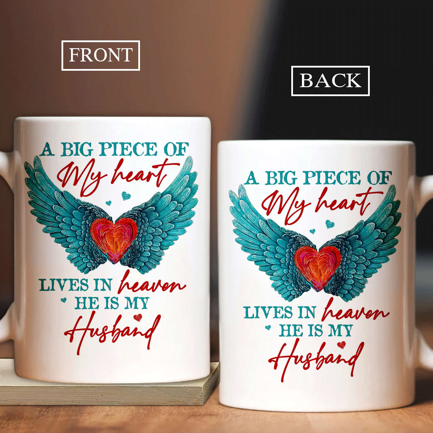 Memorial White Mug - Blue angel wings, Red heart- Gift For Member Family - A big piece of my heart lives in heaven, He is my husband - Heaven White Mug