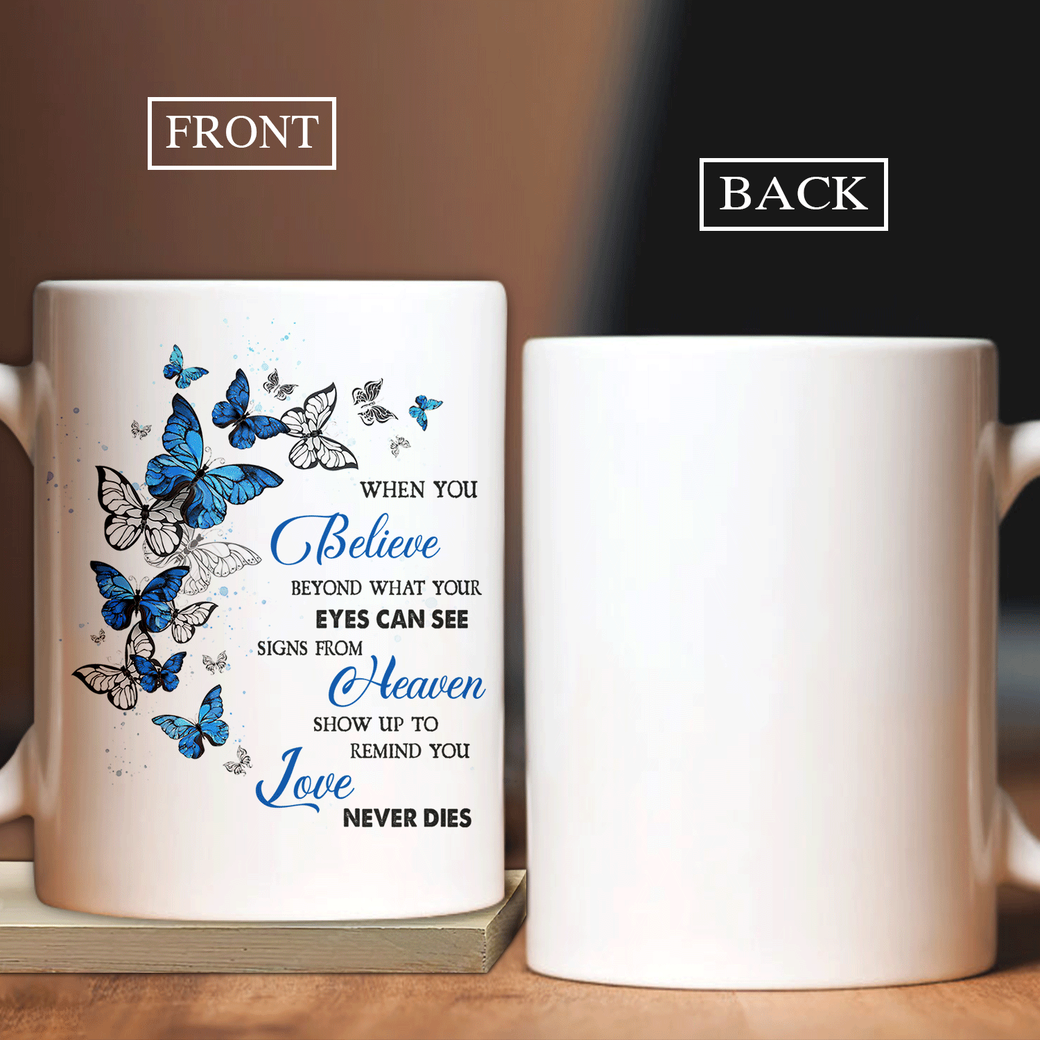 Blue butterfly, Animal pattern, Signs from heaven show up to remind you love never dies - Heaven White Mug.