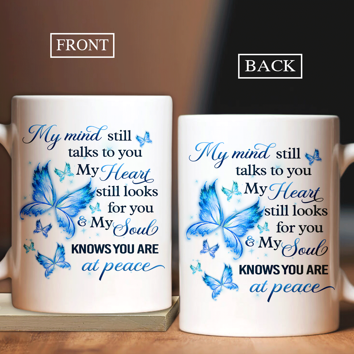 Memorial White Mug - Blue butterfly - Gift For Member Family - My heart still looks for you - Heaven White Mug