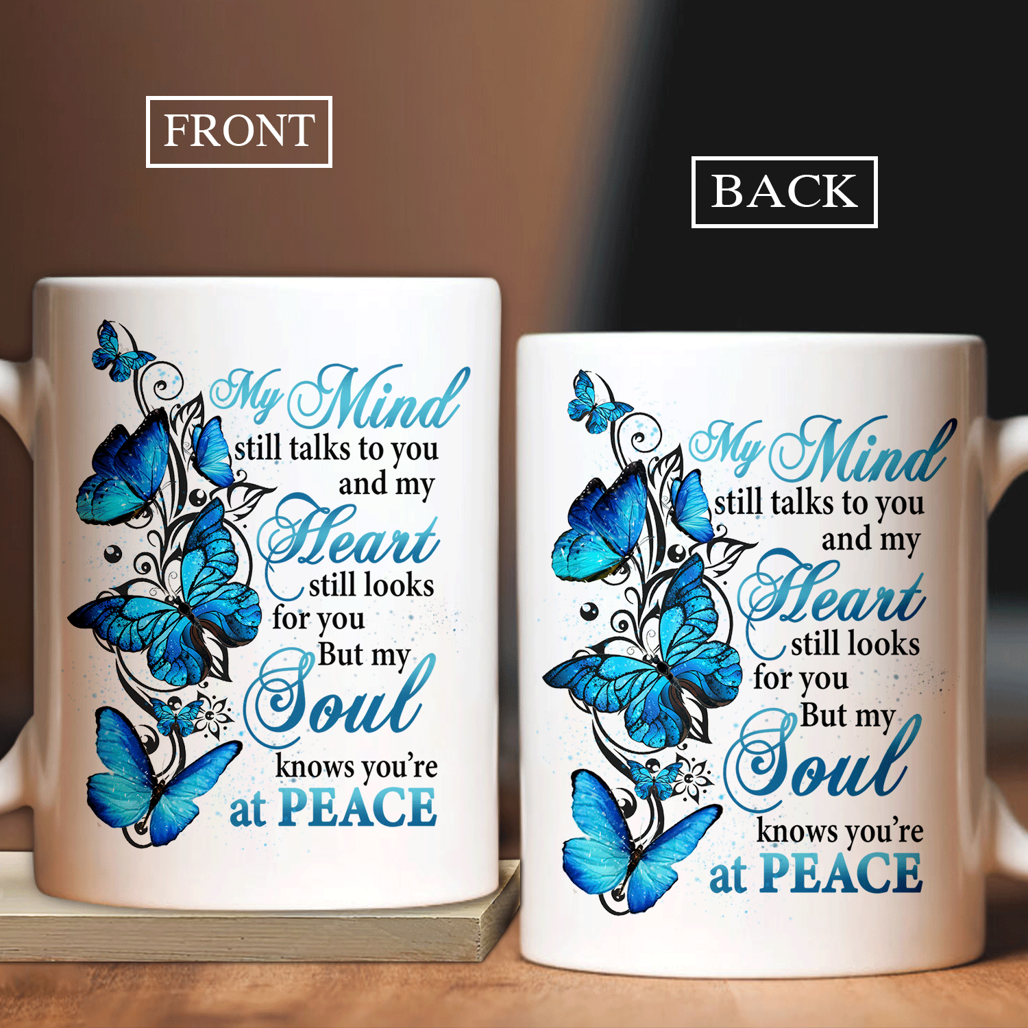 Blue butterfly, My mind still talks to you, My soul knows you're at peace - Heaven White Mug.