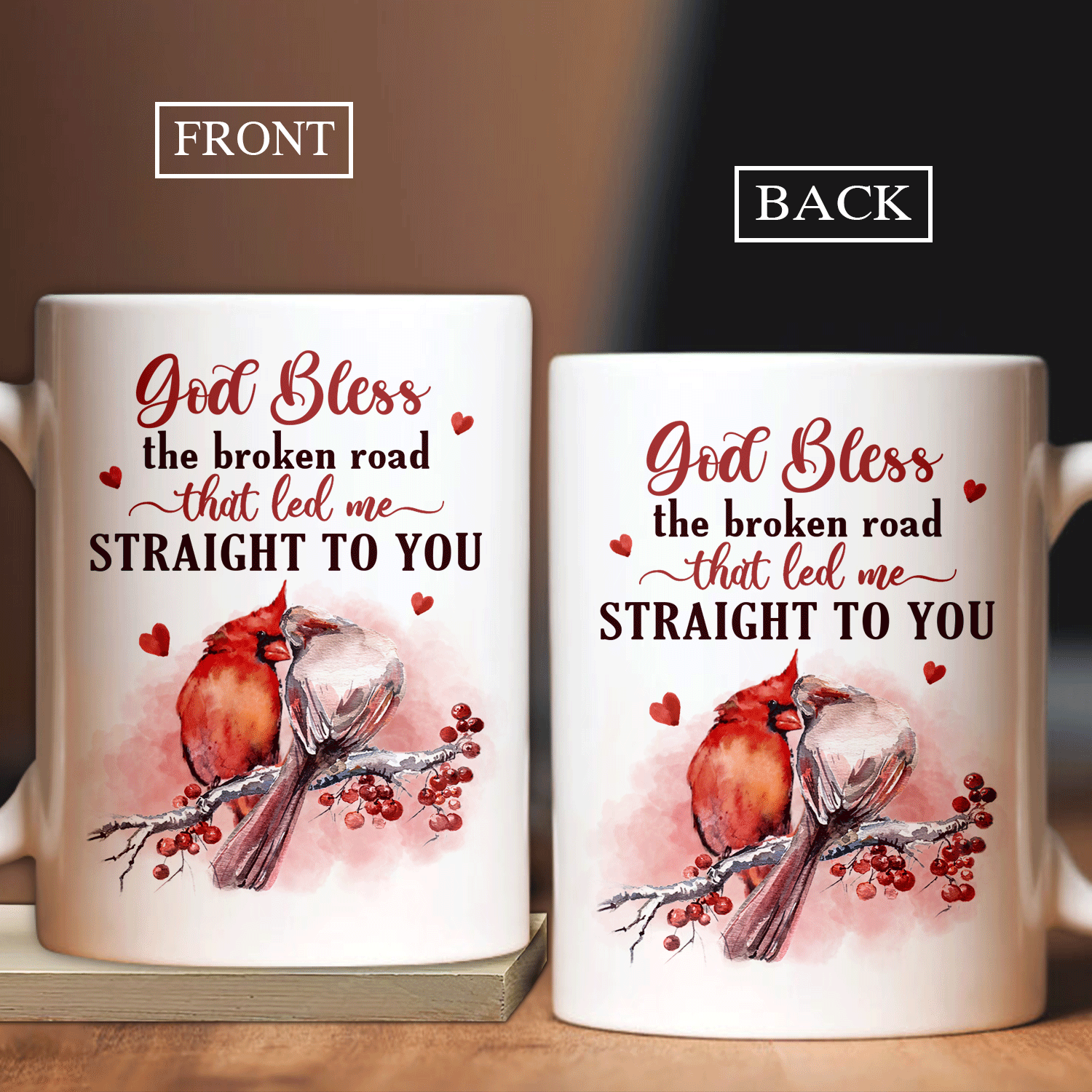Cardinal couple, Cranberry branch, Love message, God bless the broken road that led me straight to you - Heaven White Mug.