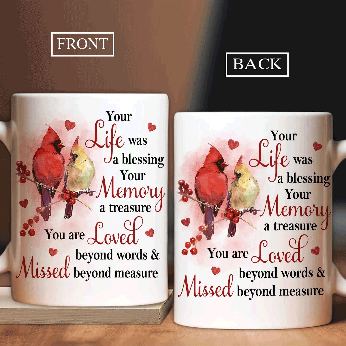 Memorial White Mug - Red cranberry, Watercolor cardinal, Heart symbol - Gift for members family - Your life was a blessing - Heaven White Mug.