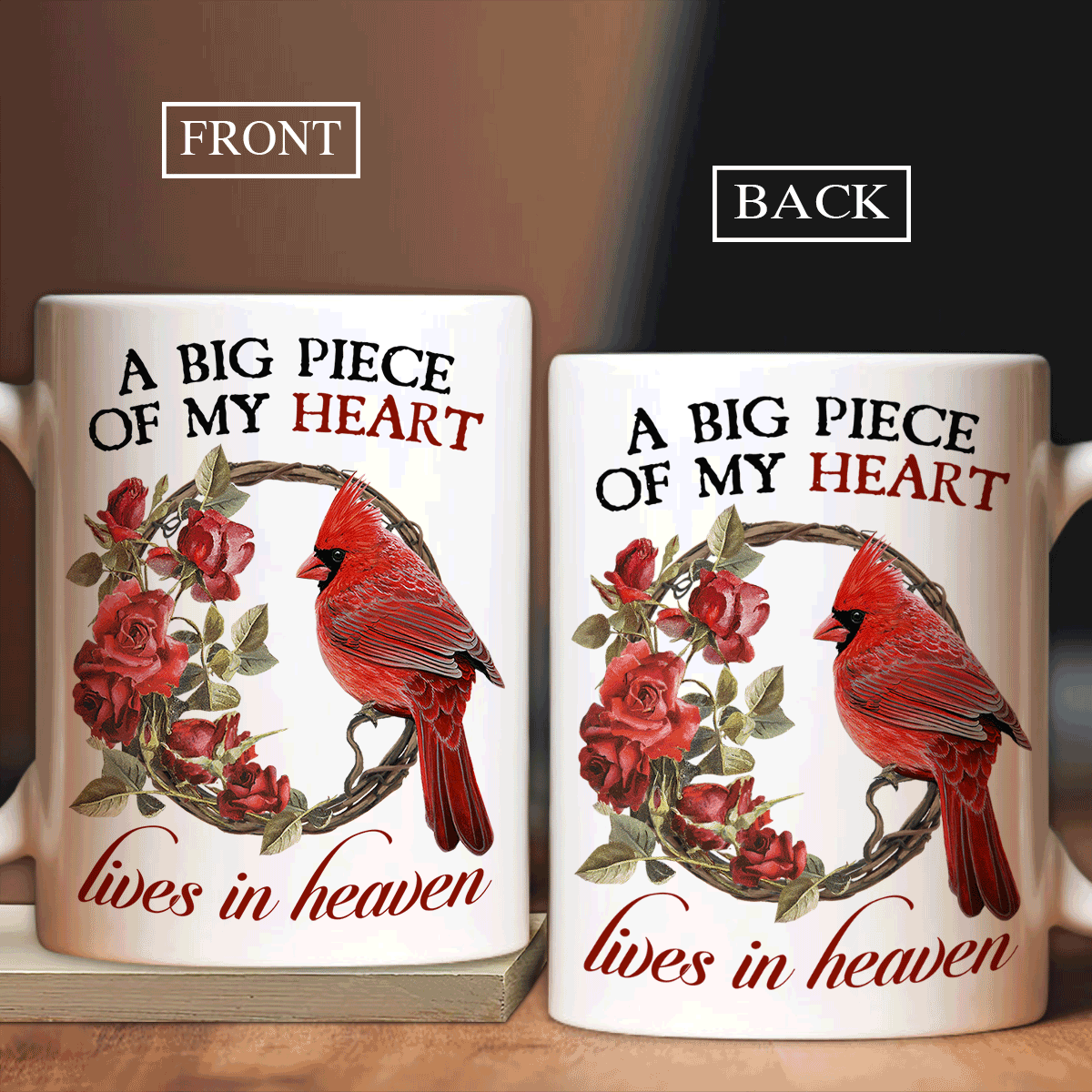 Memorial White Mug - Rose flowers, Northern cardinal painting - Gift for members family - A big piece of my heart - Heaven White Mug.