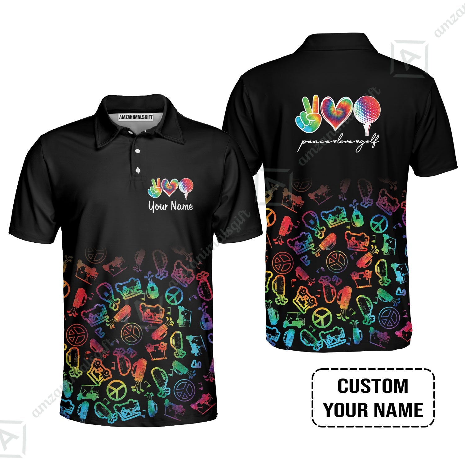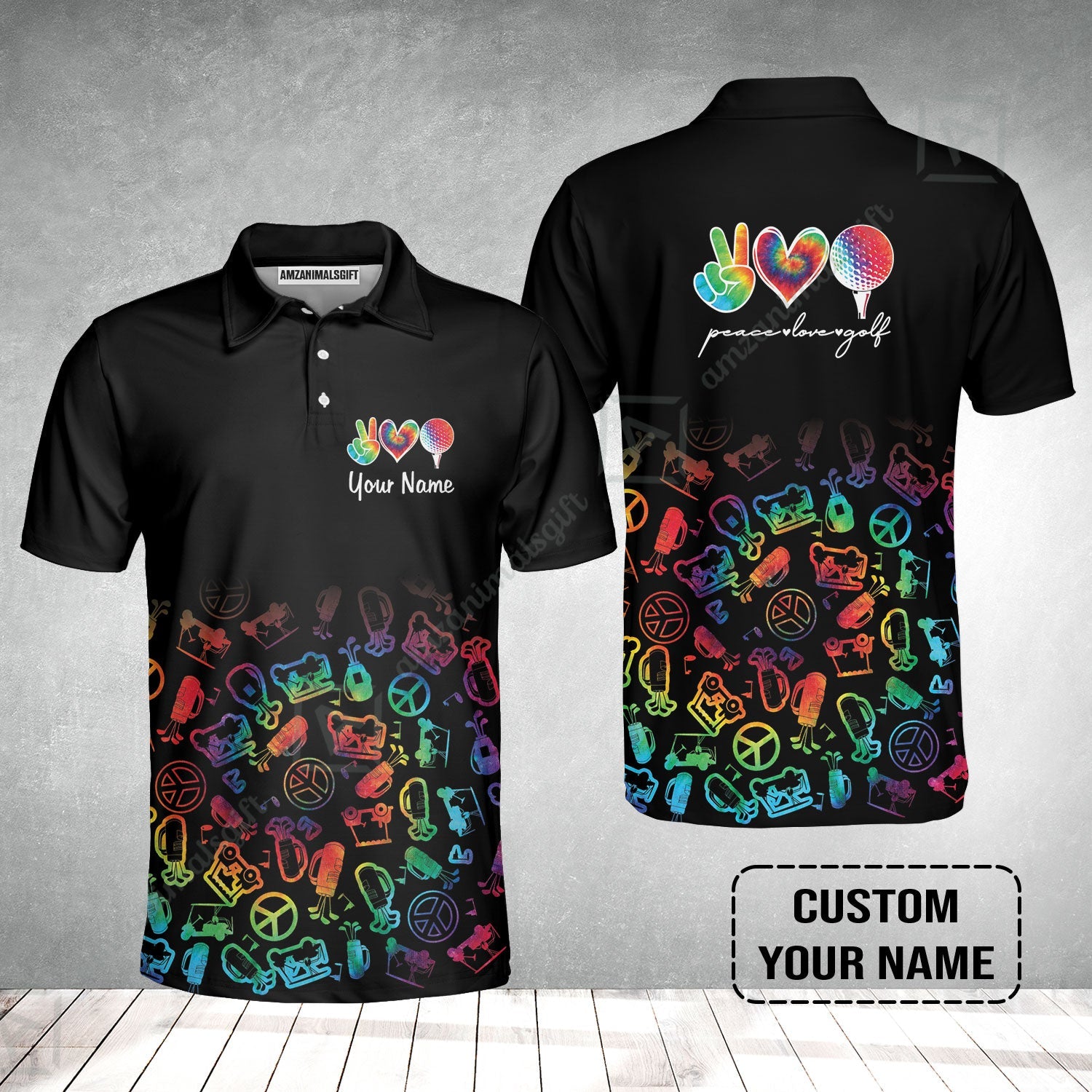 Men Golf Polo Shirt Custom Name, Watercolor Peace Love Golf Golf Icon Personalized Polo Shirt