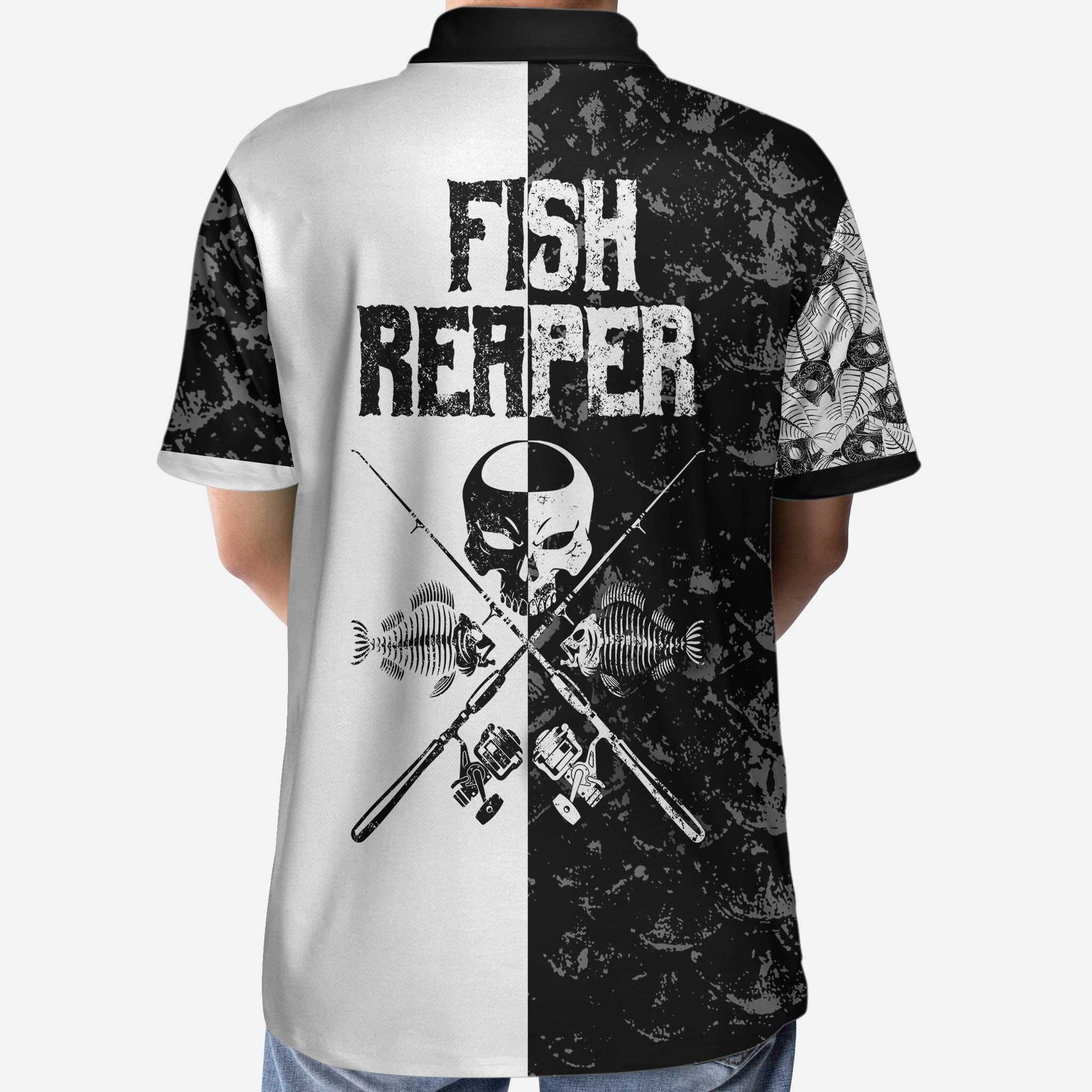 Men Polo Shirt - Black & White Fish Reaper With Grim Reaper Polo Shirt, Skull Polo Shirt, Best Fishing Shirt For Men