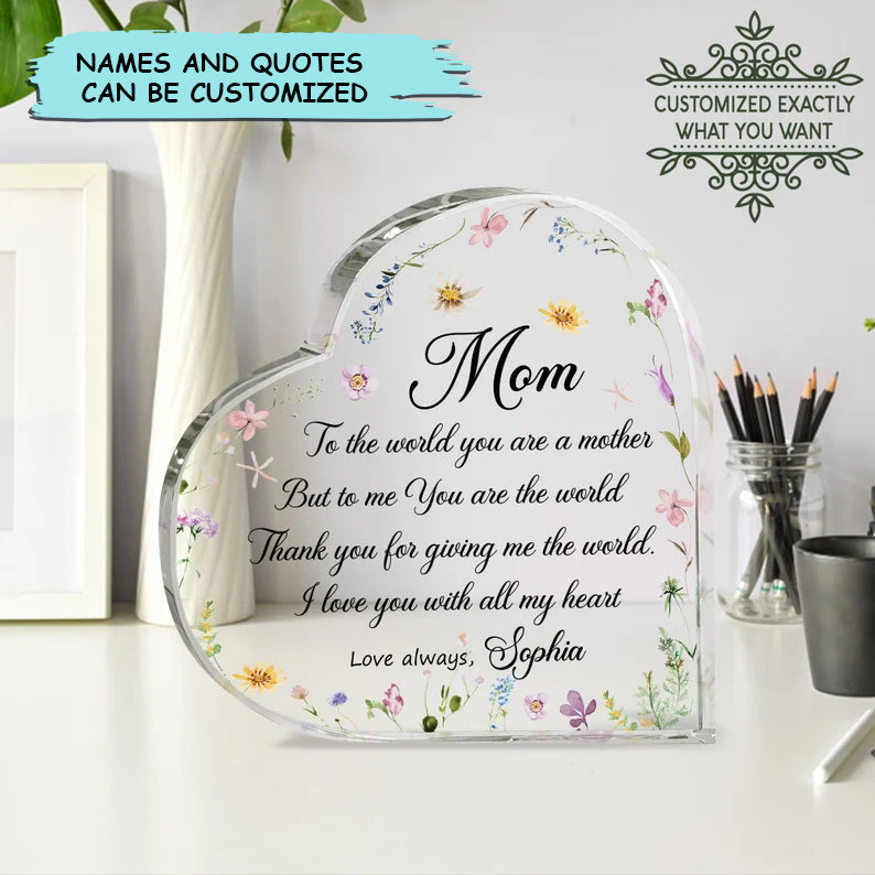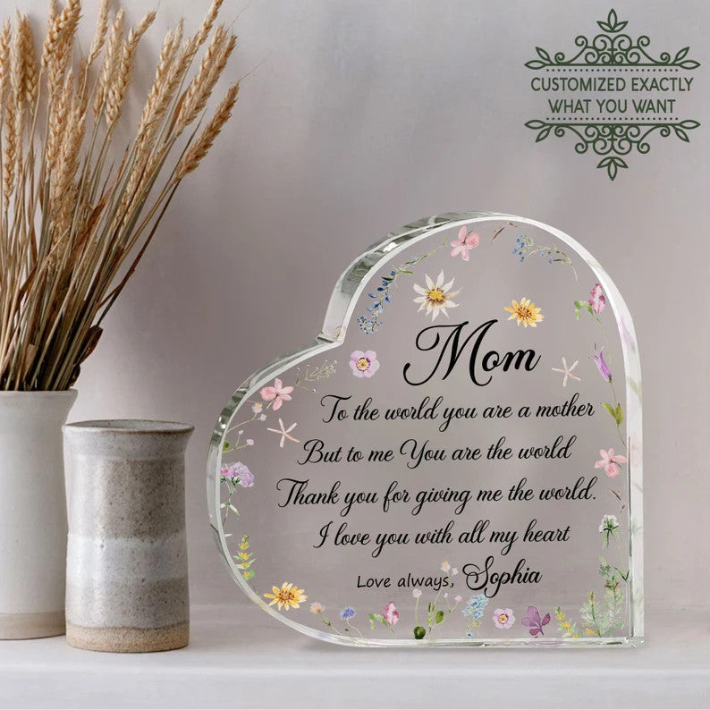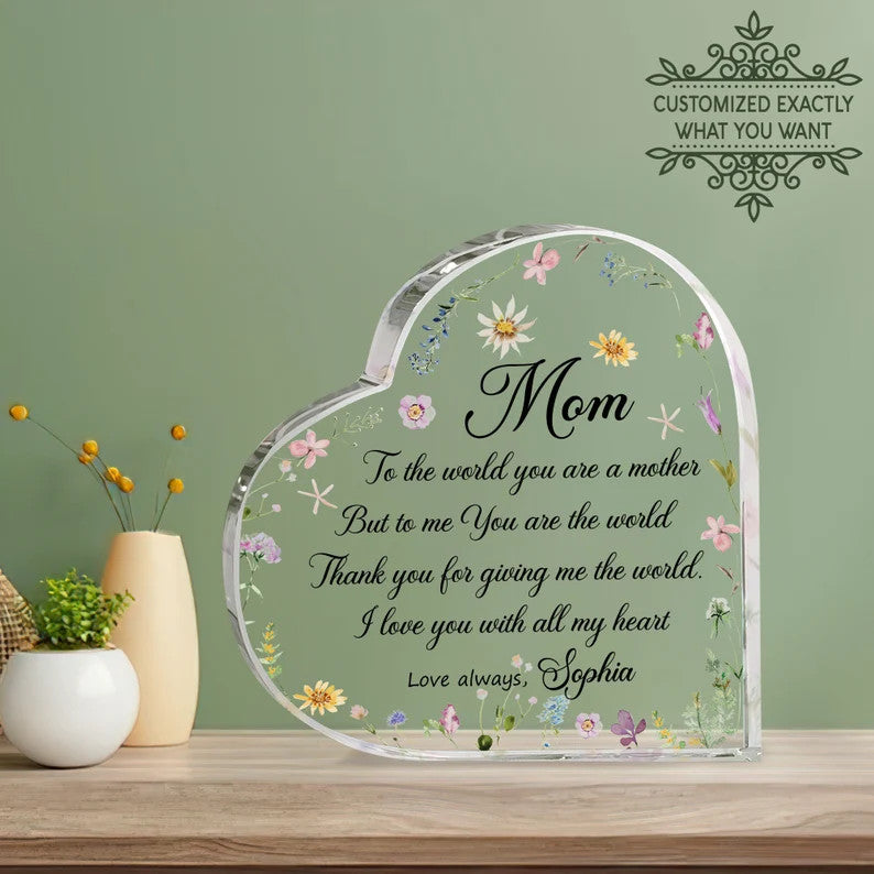 Mother's Day Flowers Mom Heart Shaped Acrylic Plaque, Custom Names And Quotes Heart Shaped Acrylic, Personalized Gift For Mom From Daughter