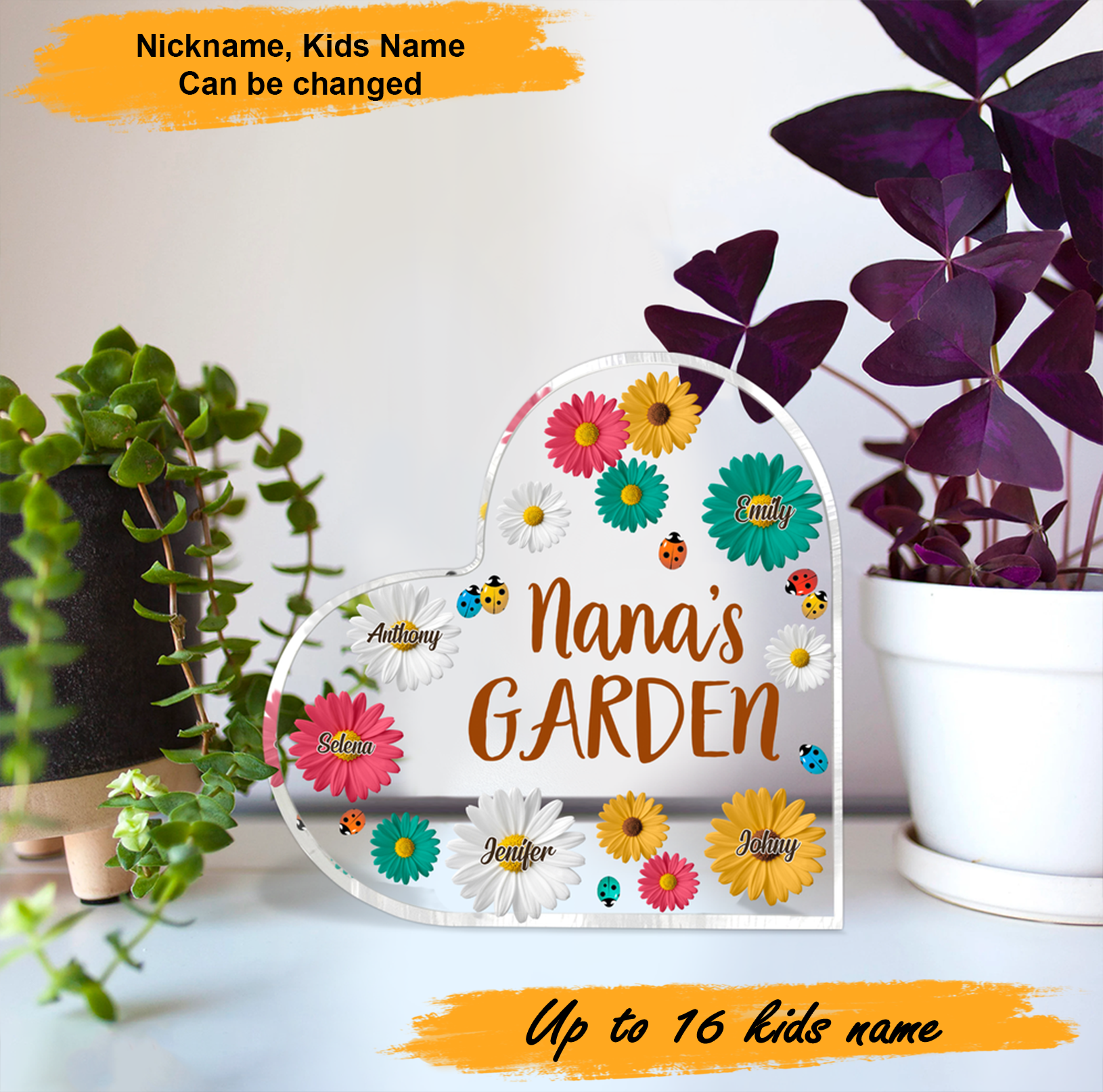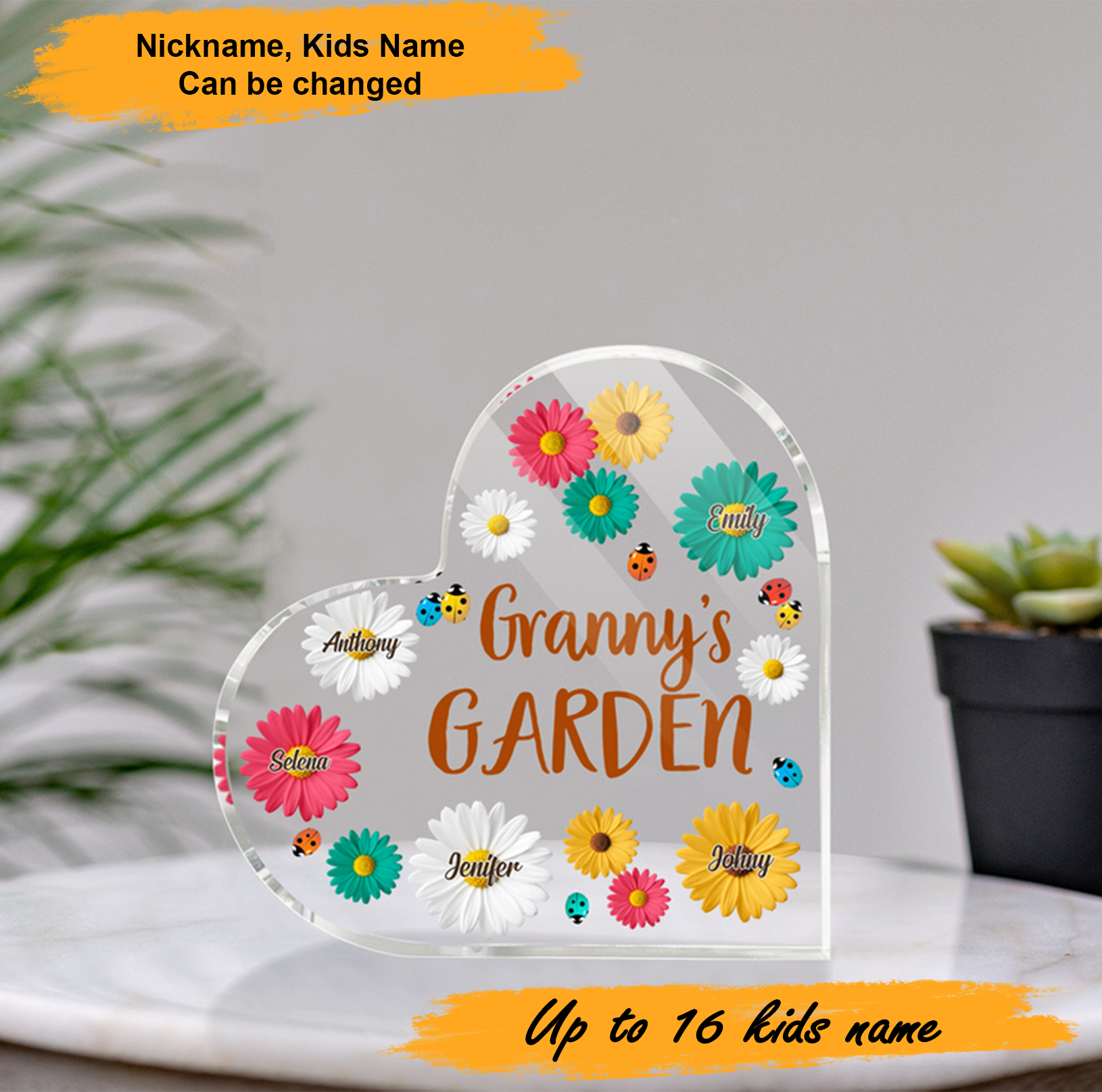 Mother's Day Grandma Flower Garden, Personalized Heart Shaped Acrylic Plaque - Custom Name Gifts For Nana, Mother, Grandma, Mom, Mama, Gigi