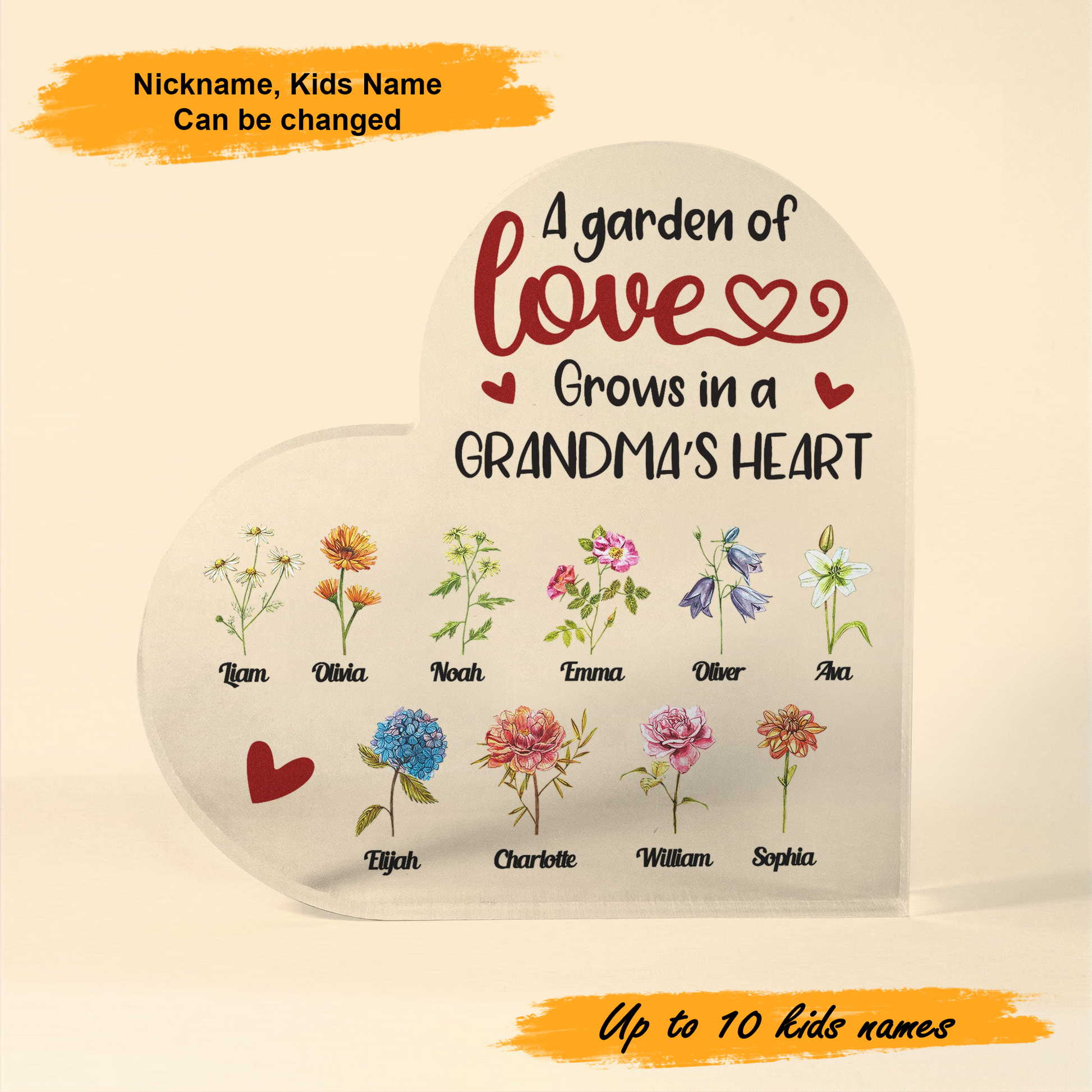 Mother's Day Grandma's Garden, Personalized Heart Shaped Acrylic Plaque - Custom Name Gifts For Grandma, Mother, Mom, Mama, Gigi, Nana