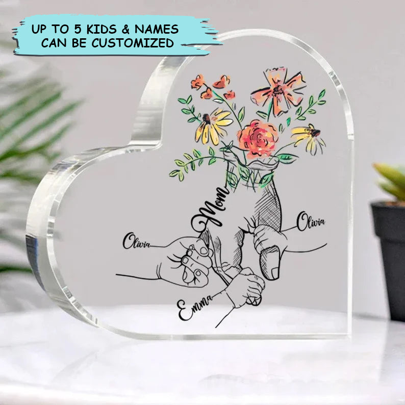 Mother's Day Kid Holding Mother's Hands Heart Shaped Acrylic Plaque, Custom Names Heart Shaped Acrylic, Personalized Gift For Mom, Grandma, Mimi, Nana