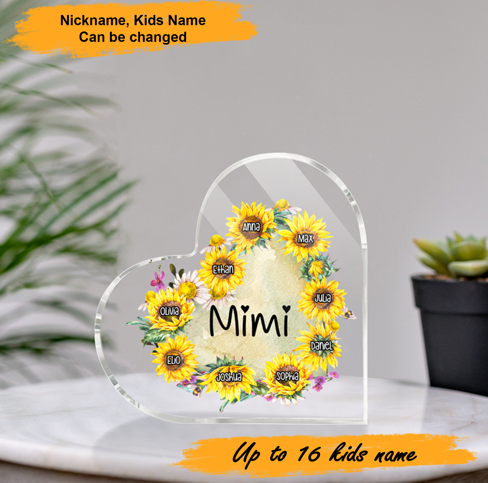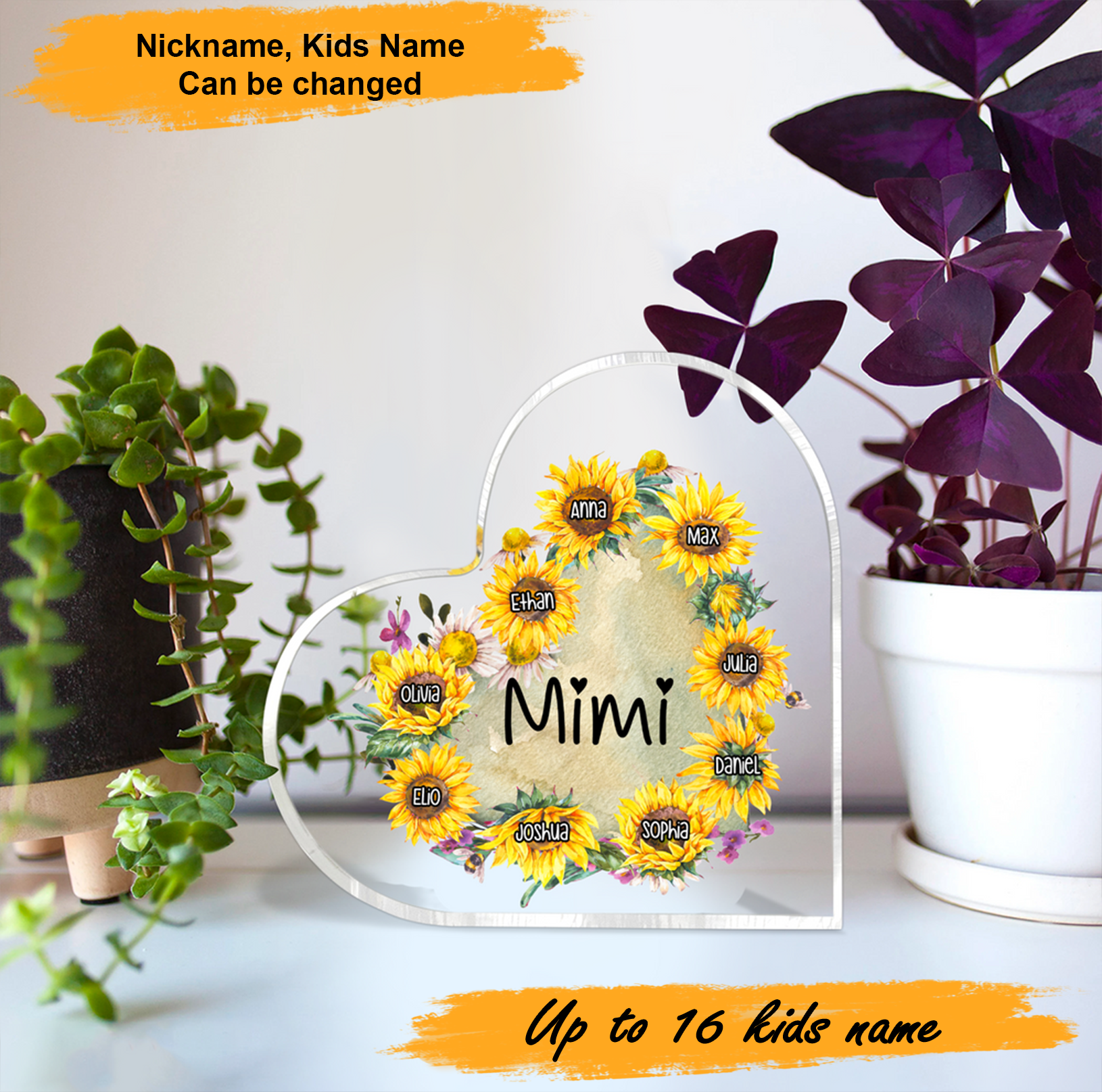 Mother's Day Mimi Sunflower Heart, Personalized Heart Shaped Acrylic Plaque - Custom Name Gifts For Nana, Mother, Grandma, Mom, Mama, Gigi