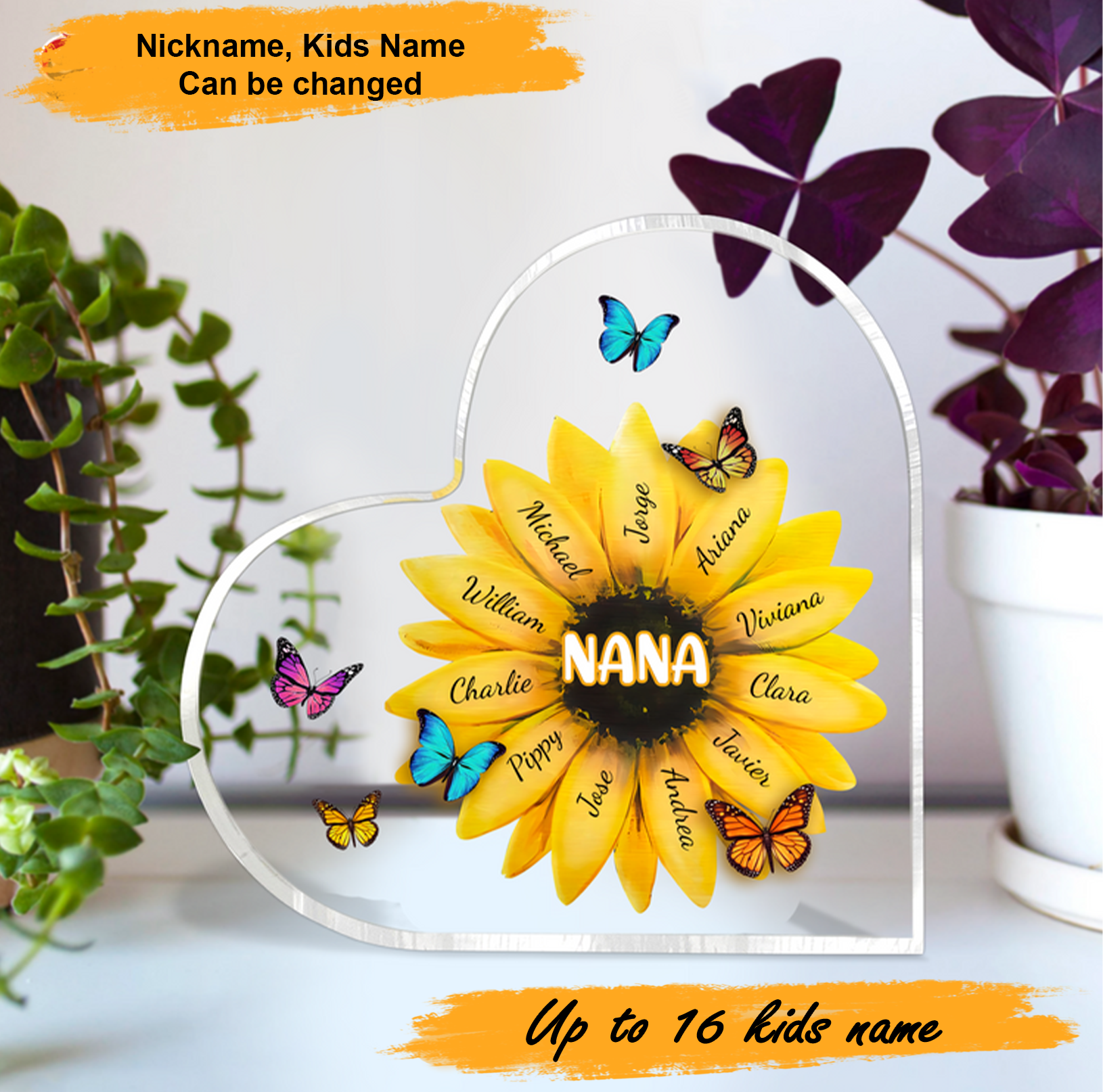 Mother's Day Nana Sunflower Personalized Heart Shaped Acrylic Plaque - Custom Name Gifts For Nana, Mother, Grandma, Mom, Mama, Gigi