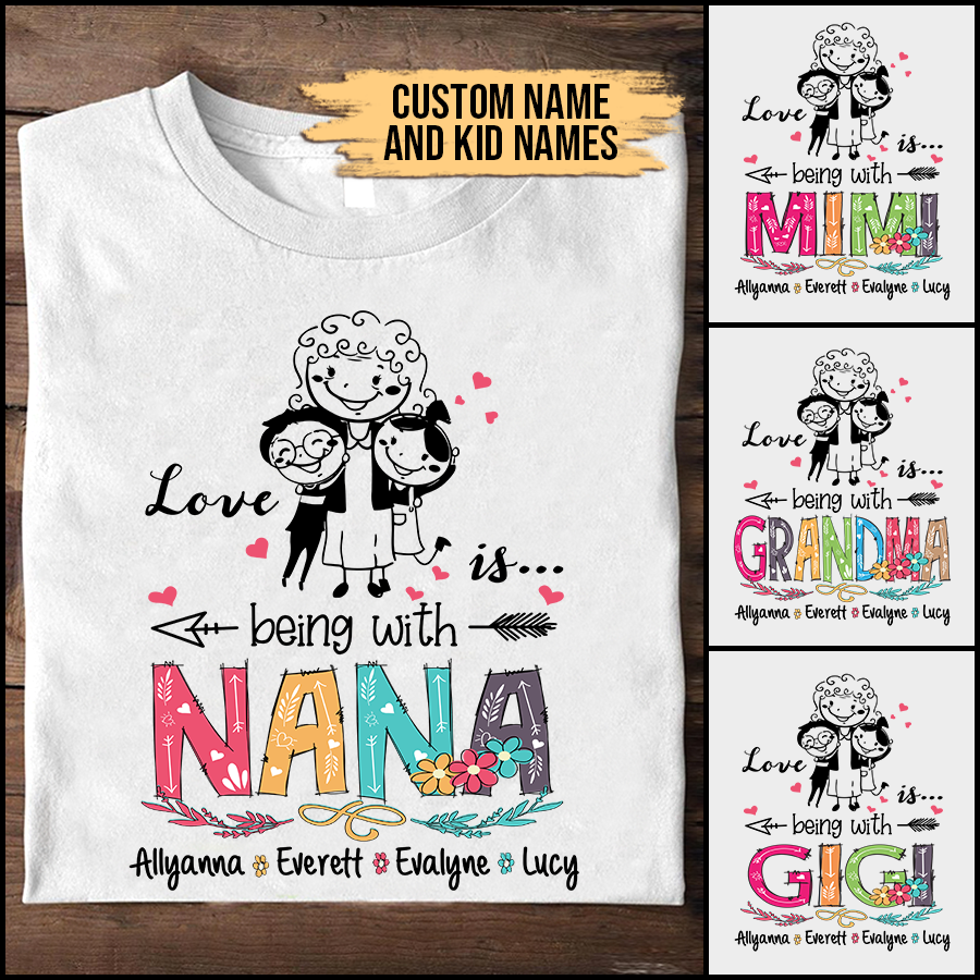 Nana and Kids Custom Name T-shirt, Love Is Being With Grandma Personalized Shirt - Perfect Gift For Gigi, Nana, Mimi, Grandma