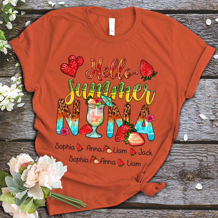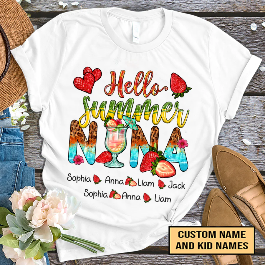 Nana And Kids Custom Name T-Shirt, Mother's Day Personalized T-Shirt, Hello Summer Strawberry Custom T-Shirt - Gift For Granma, Mimi, Nana, Grammy