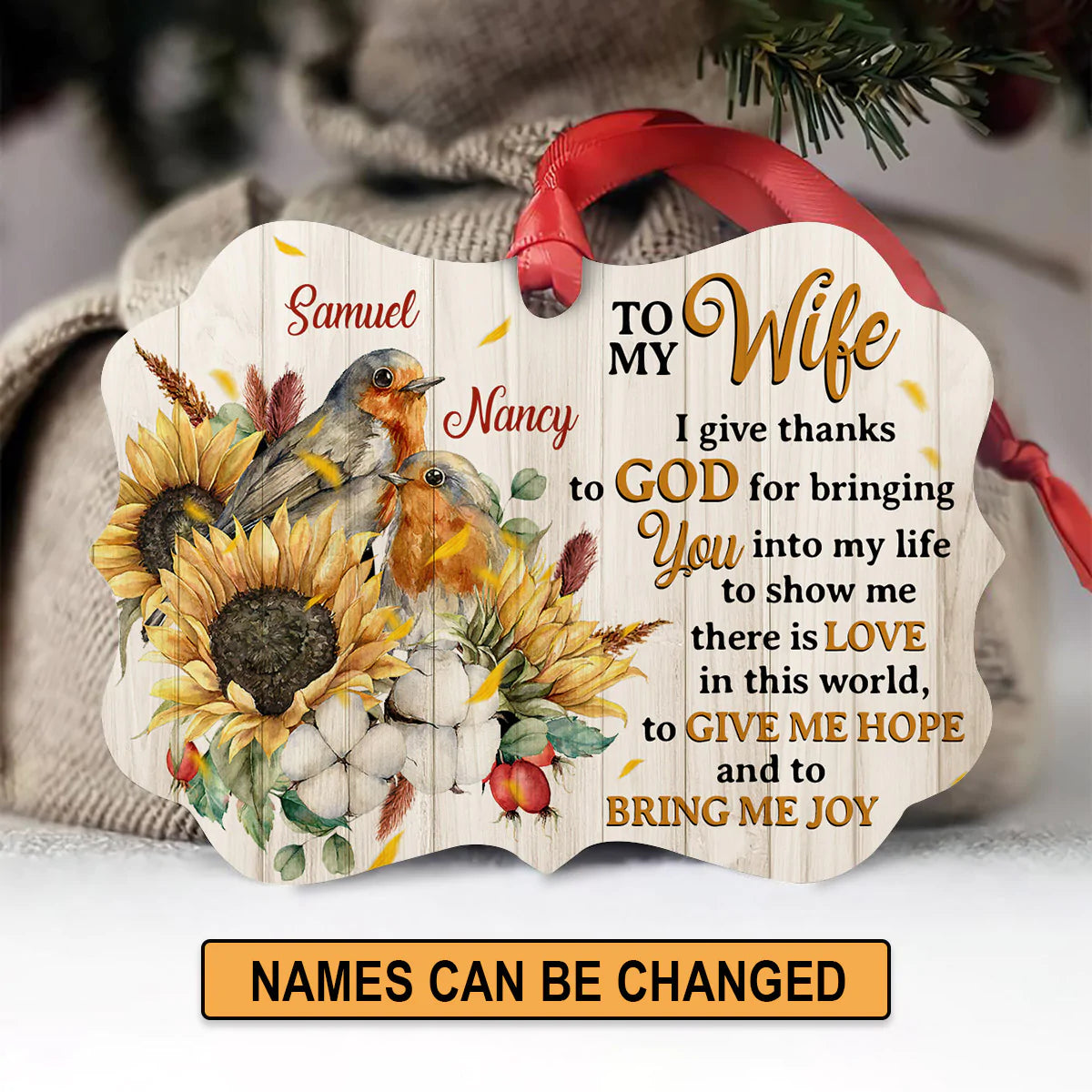 Personalized Gift For Wife Aluminum Ornament - Robin Redbreast Bird, Sunflower Aluminium Ornament - Custom Gift For Wife, Christian Couple, Spouse, Lover - To My Wife I Give Thanks To God For Bringing