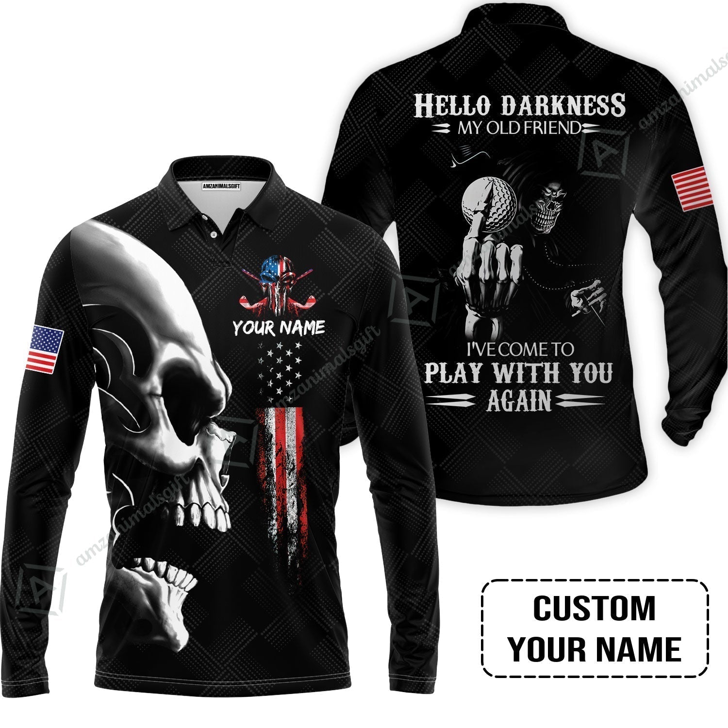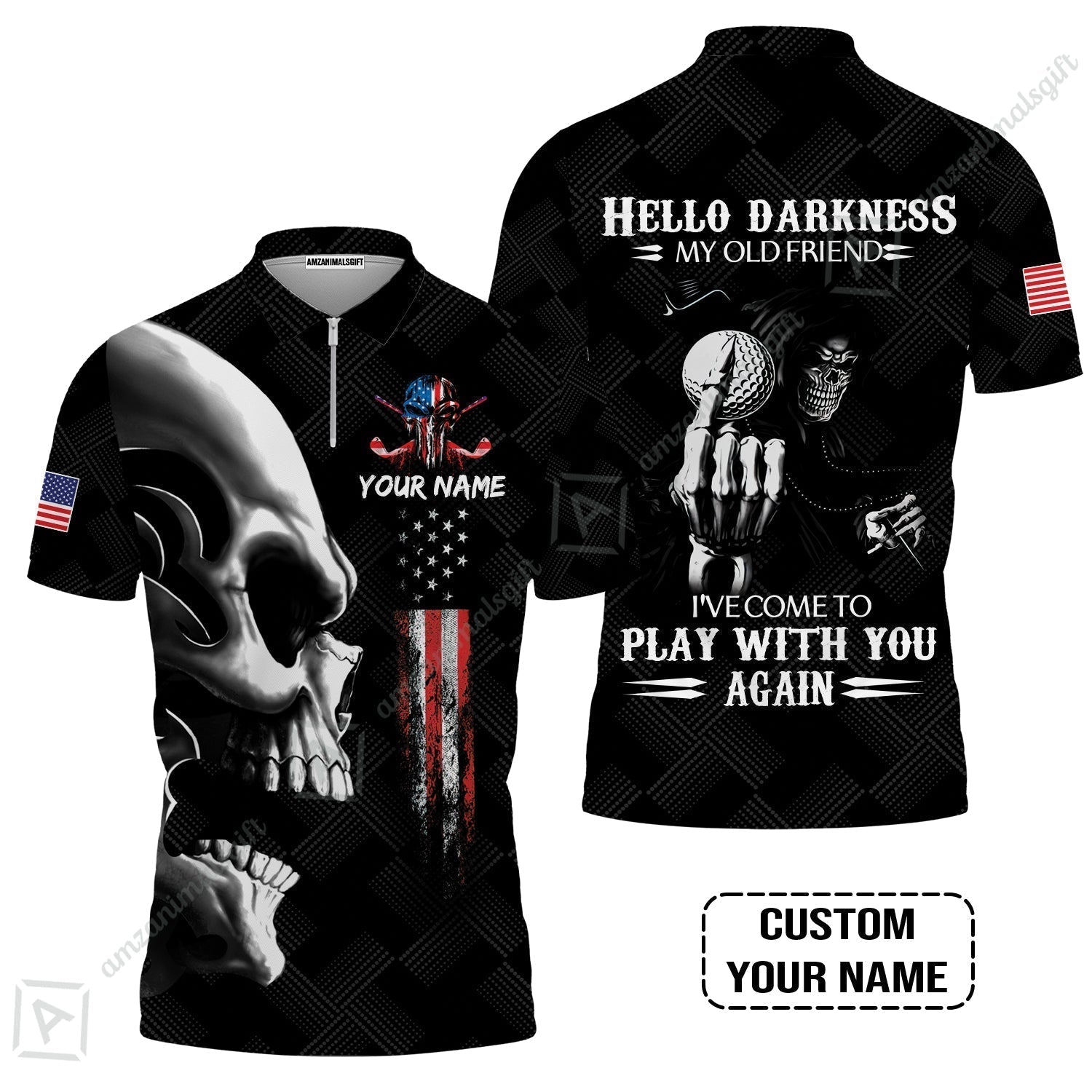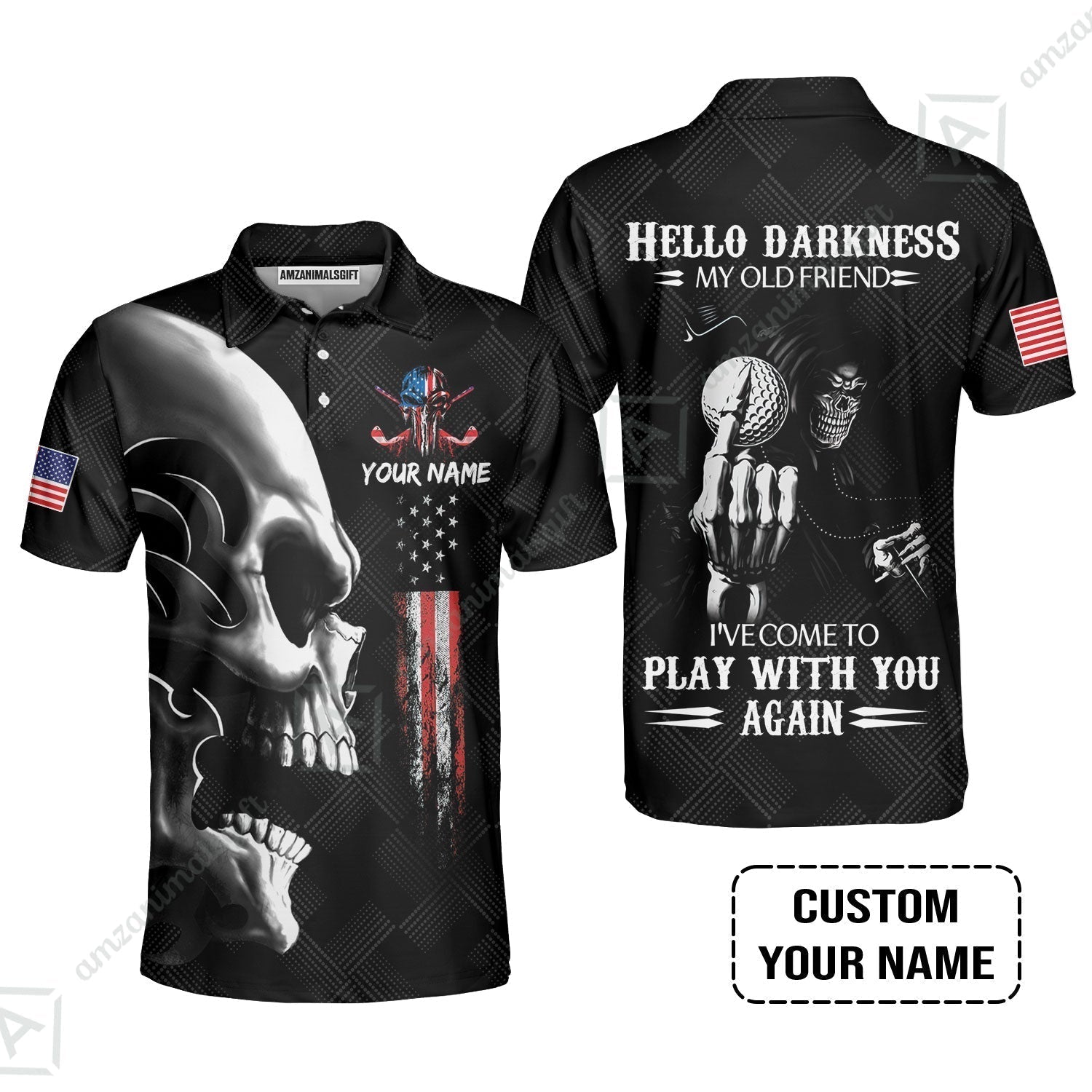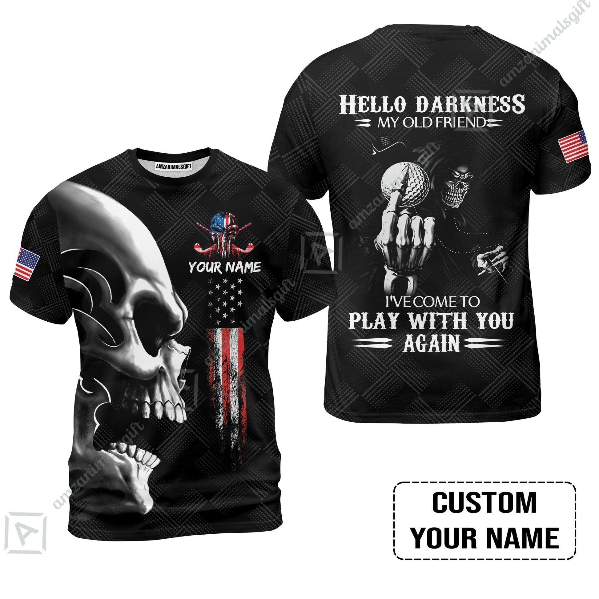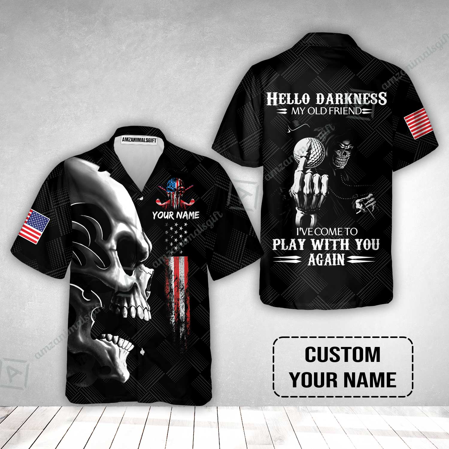 Personalized Golf Hawaiian Shirt- Custom Name Skull Shirt, Golf American Flag Hello Darkness My Old Friend Hawaiian Shirt