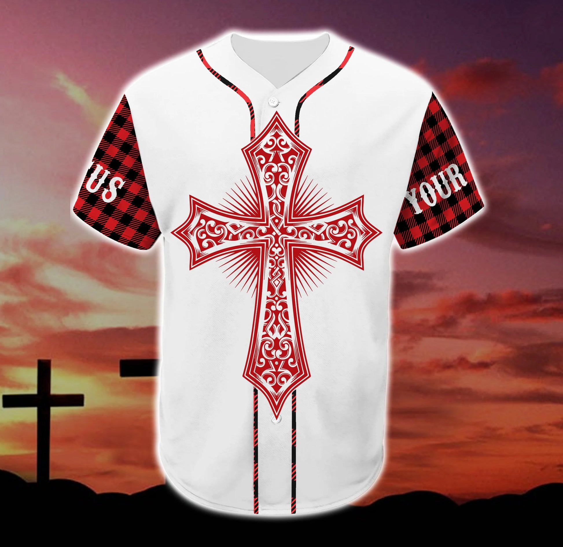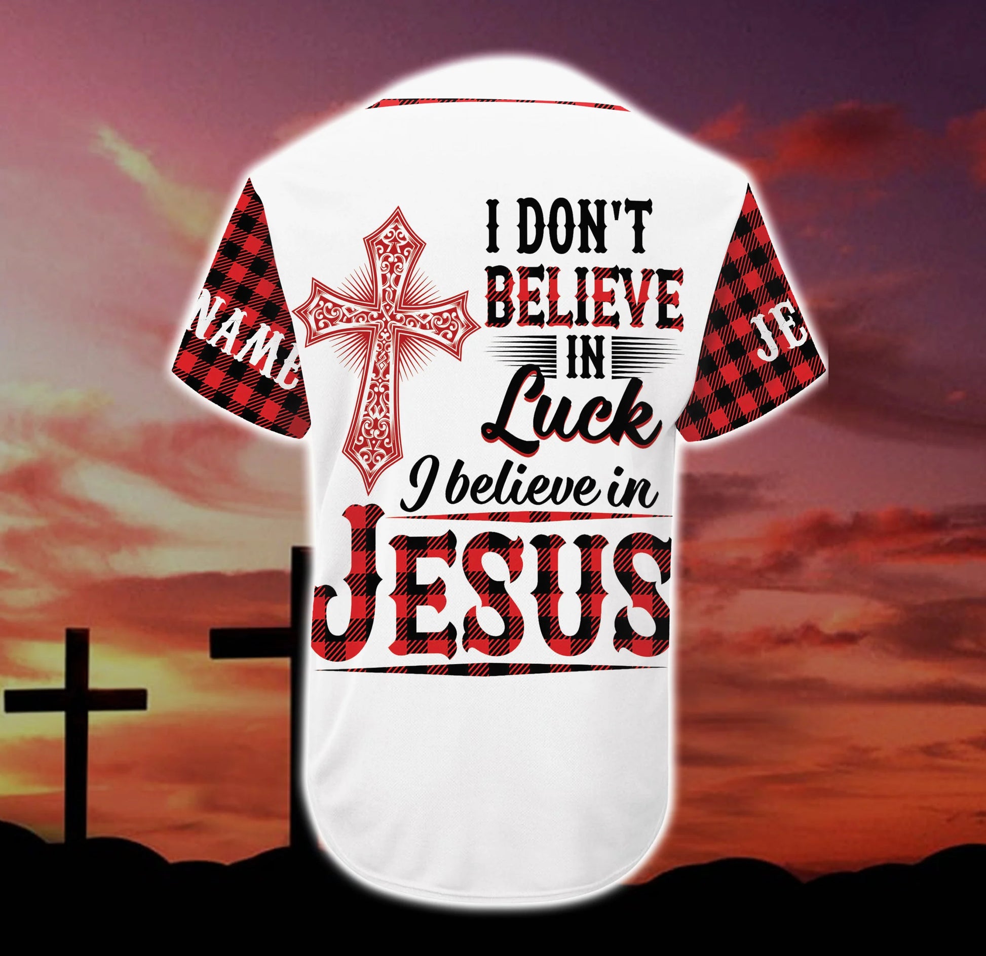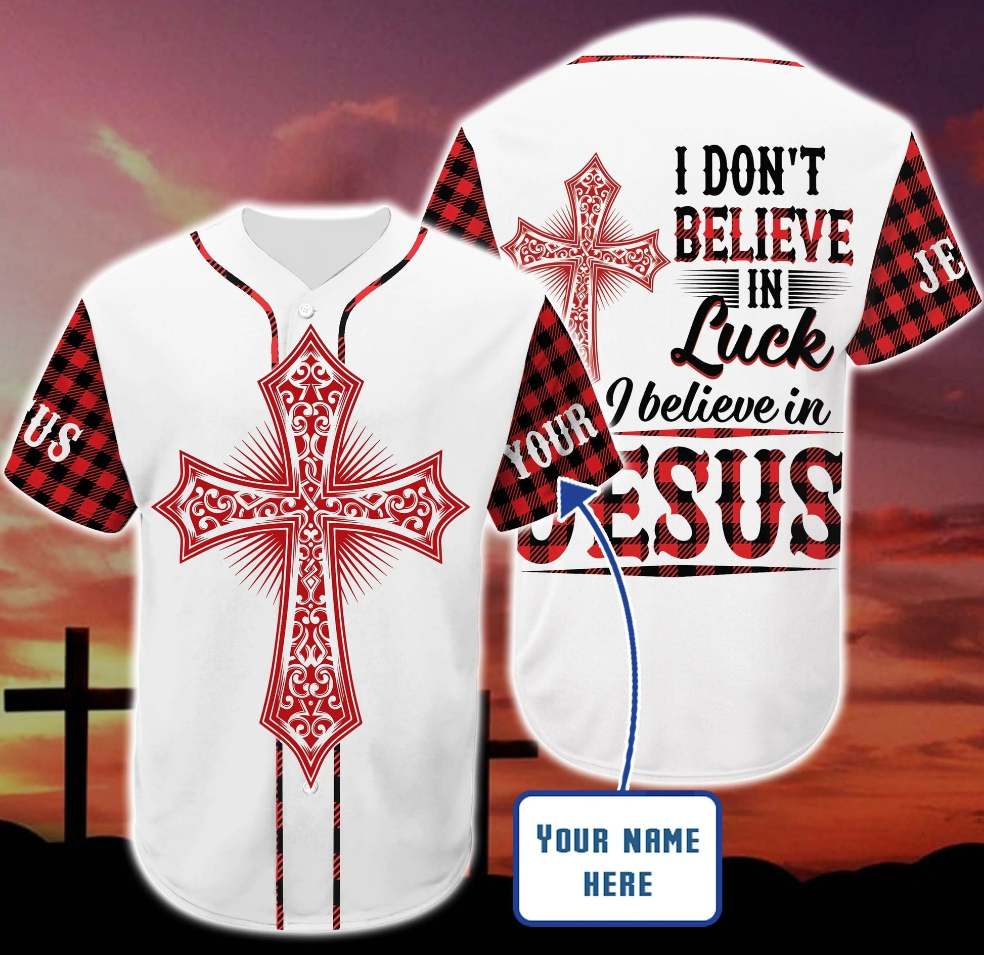 Personalized Jesus Baseball Jersey - Red Cross Baseball Jersey - Gift For Christians - I Dont Believe In Luck I Believe In Jesus Custom Baseball Jersey