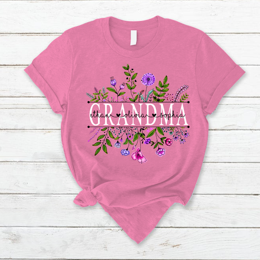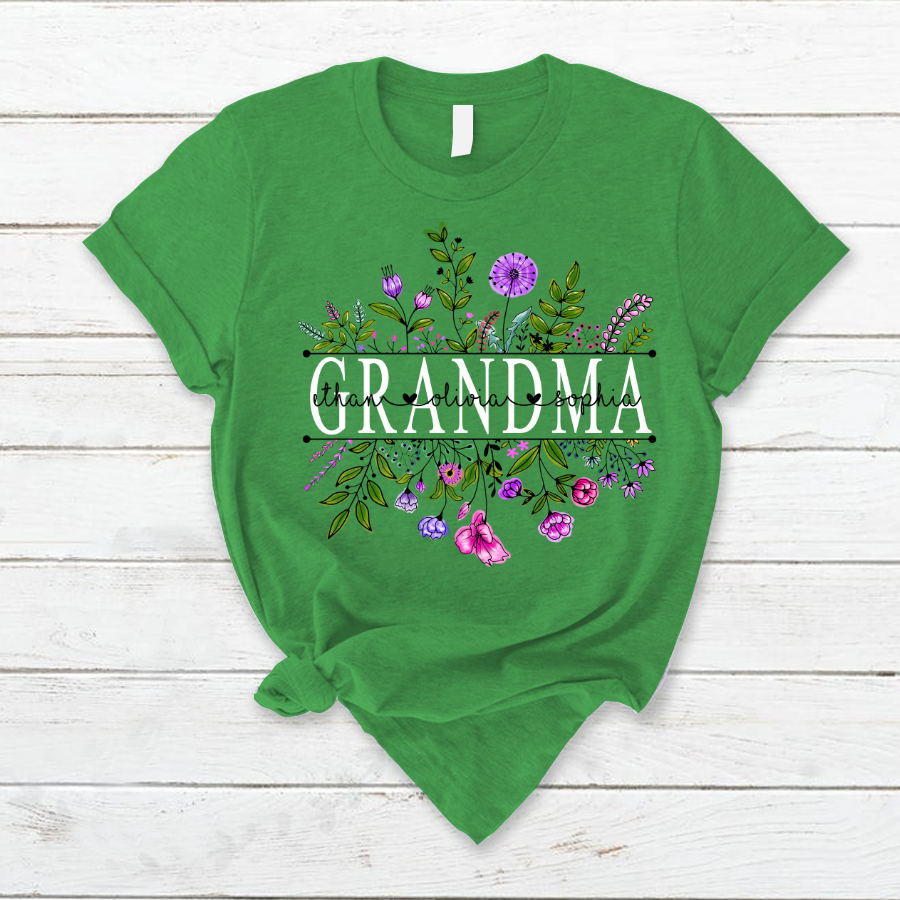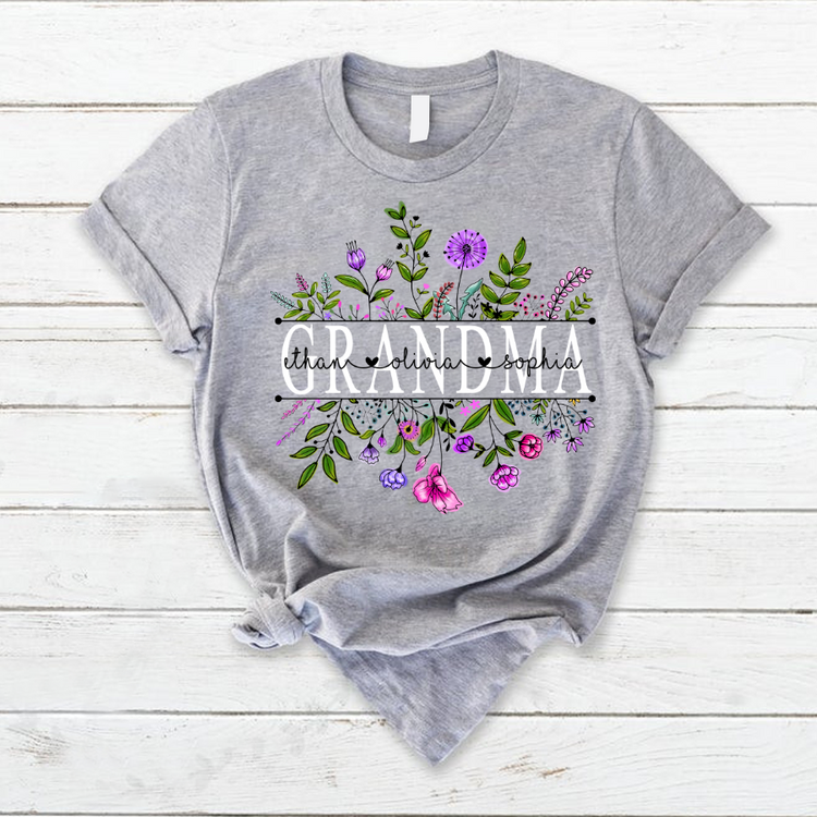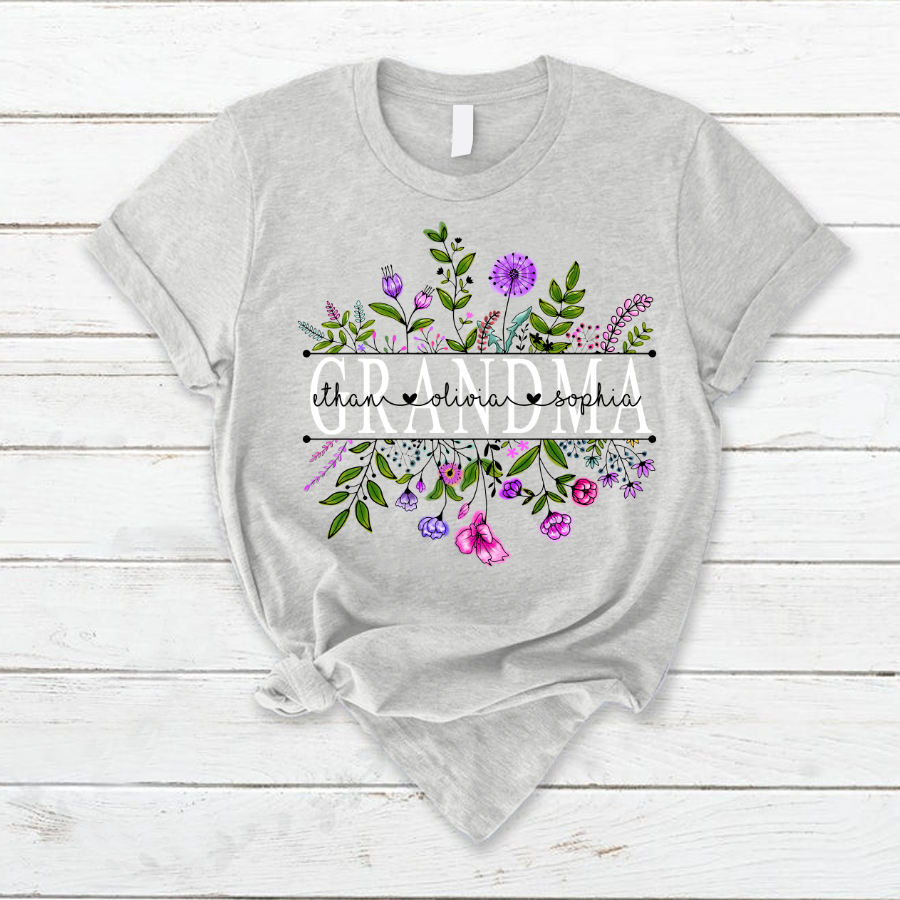 Personalized Mother's Day T-shirt, Custom Mom Nickname And Kid Name T-shirt, Wildflowers Grandma And Grandkids Watercolor Custom T-shirt