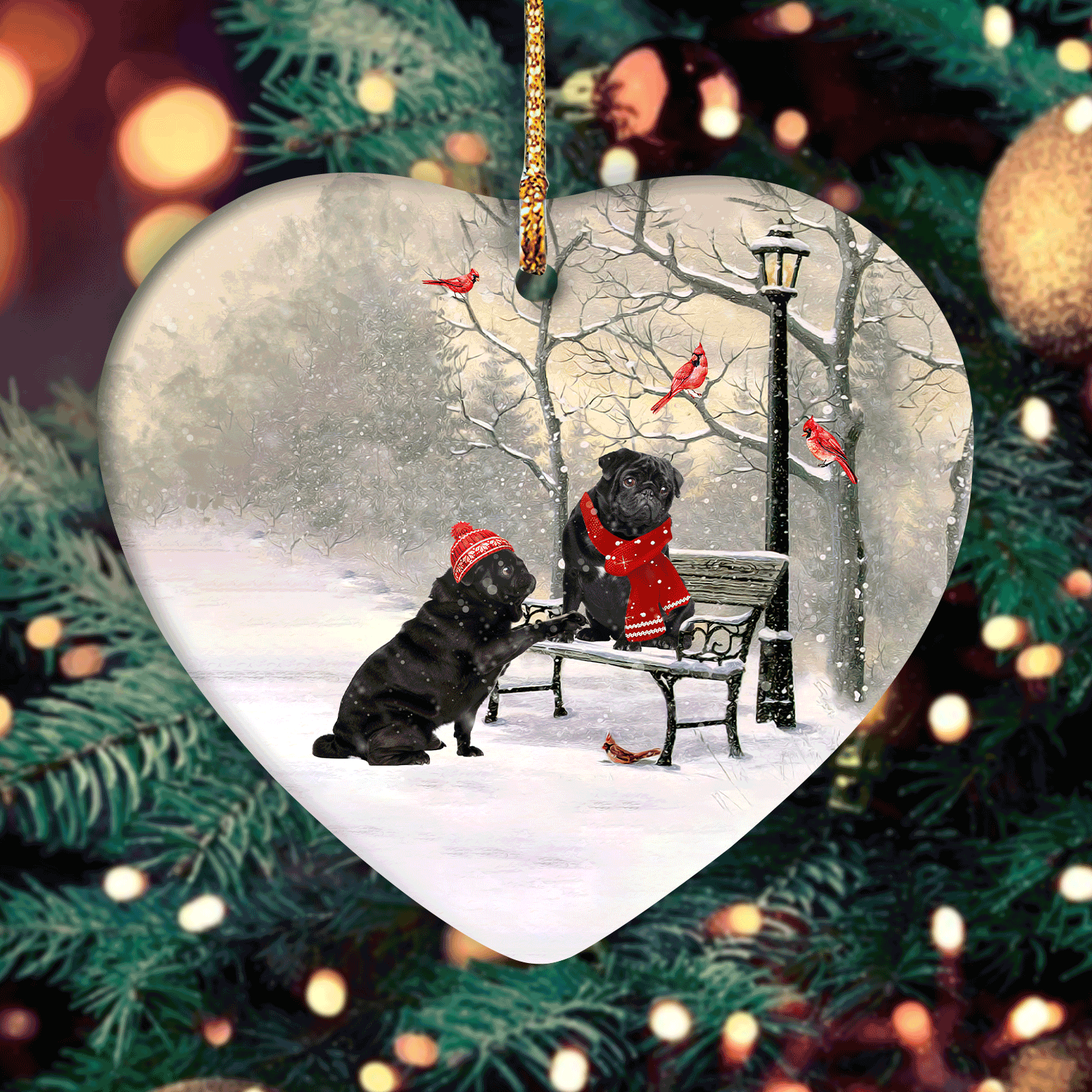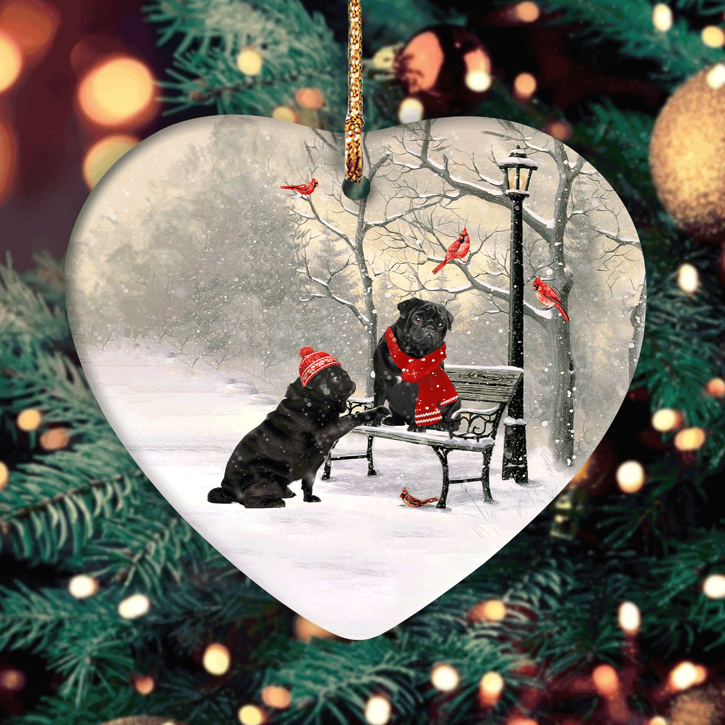 Pug - Christmas Heart Ceramic Ornament- Couple Black Pug, Winter Park, Red Cardinal, On A Date - Gifts For Christmas Home Decor, Gifts For Pug Lover, Gifts For Dog Lover, Dog Mom