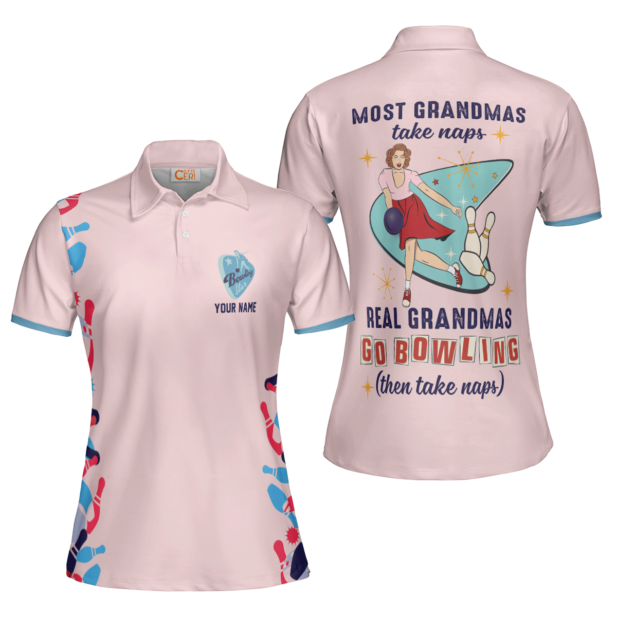Real Grandmas Go Bowling Short Sleeve Women Polo Shirt, Custom Name Bowling Shirt, Pink Grandma Bowling Shirt - Best Bowling Gift For Women