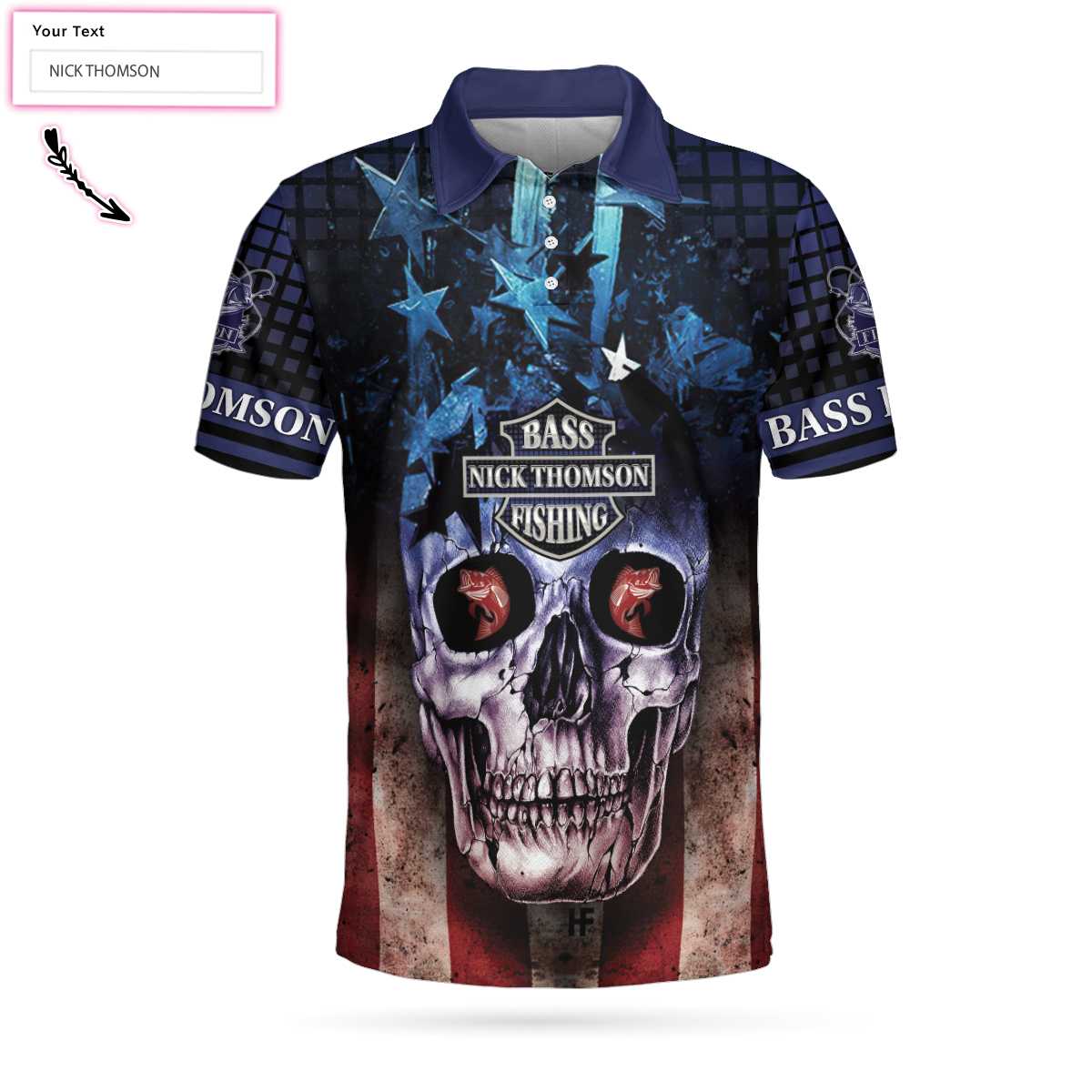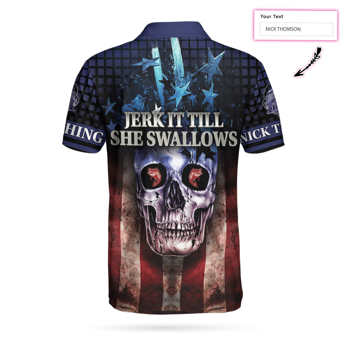 Skull Fishing Custom Name Polo Shirt, Jerk It Till She Swallows Custom Polo Shirt, Personalized American Flag Fishing Shirt - Perfect Gift For Men
