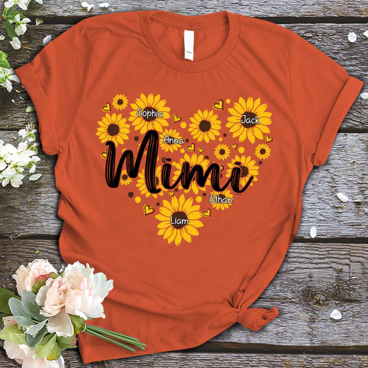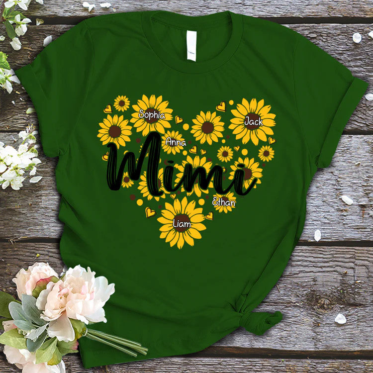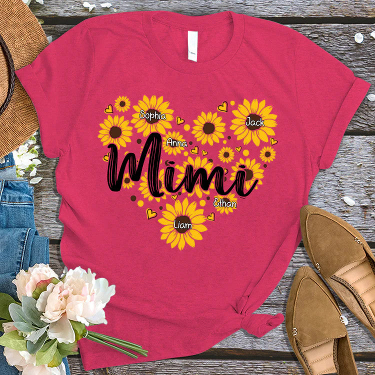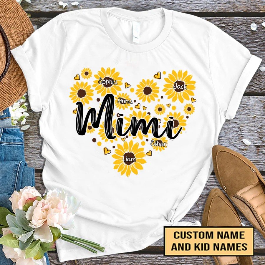 Sunflower Hearts Mimi And Kids Custom Name T-Shirt, Mother's Day Personalized T-Shirt, Sunflower Custom T-Shirt - Gift For Mimi, Nana, Grammy, Grandma