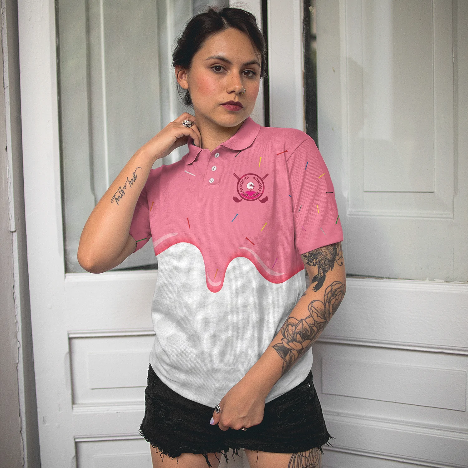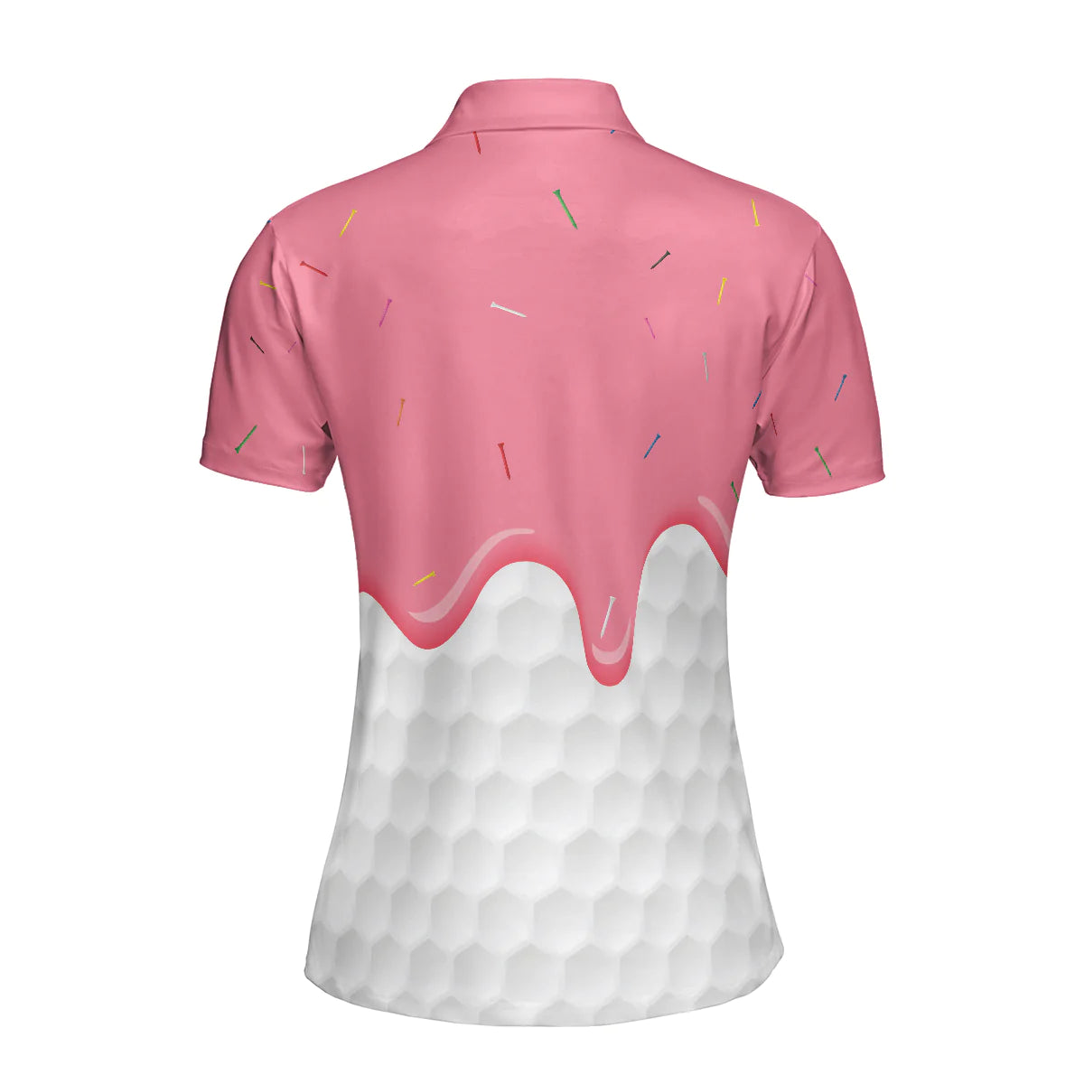 White And Pink Golf Women Polo Shirt, Ice Cream Melting On Golf Ball Cone Golf Short Sleeve Shirt For Ladies, Cool Gift For Female Golfers