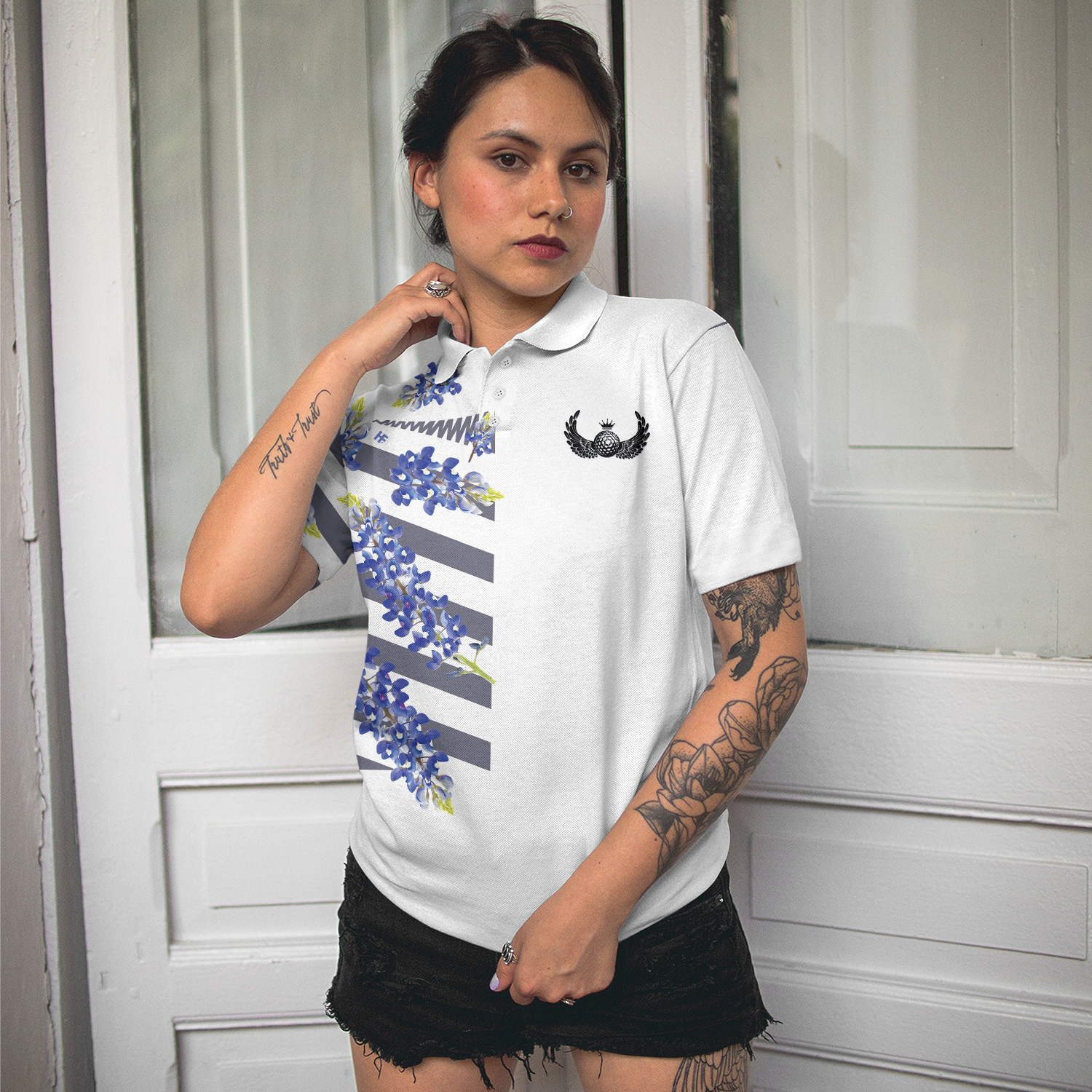 Women Polo Shirt - Bluebonnet Golf Short Sleeve Women Polo Shirt, Floral Texas Golf Shirt For Ladies