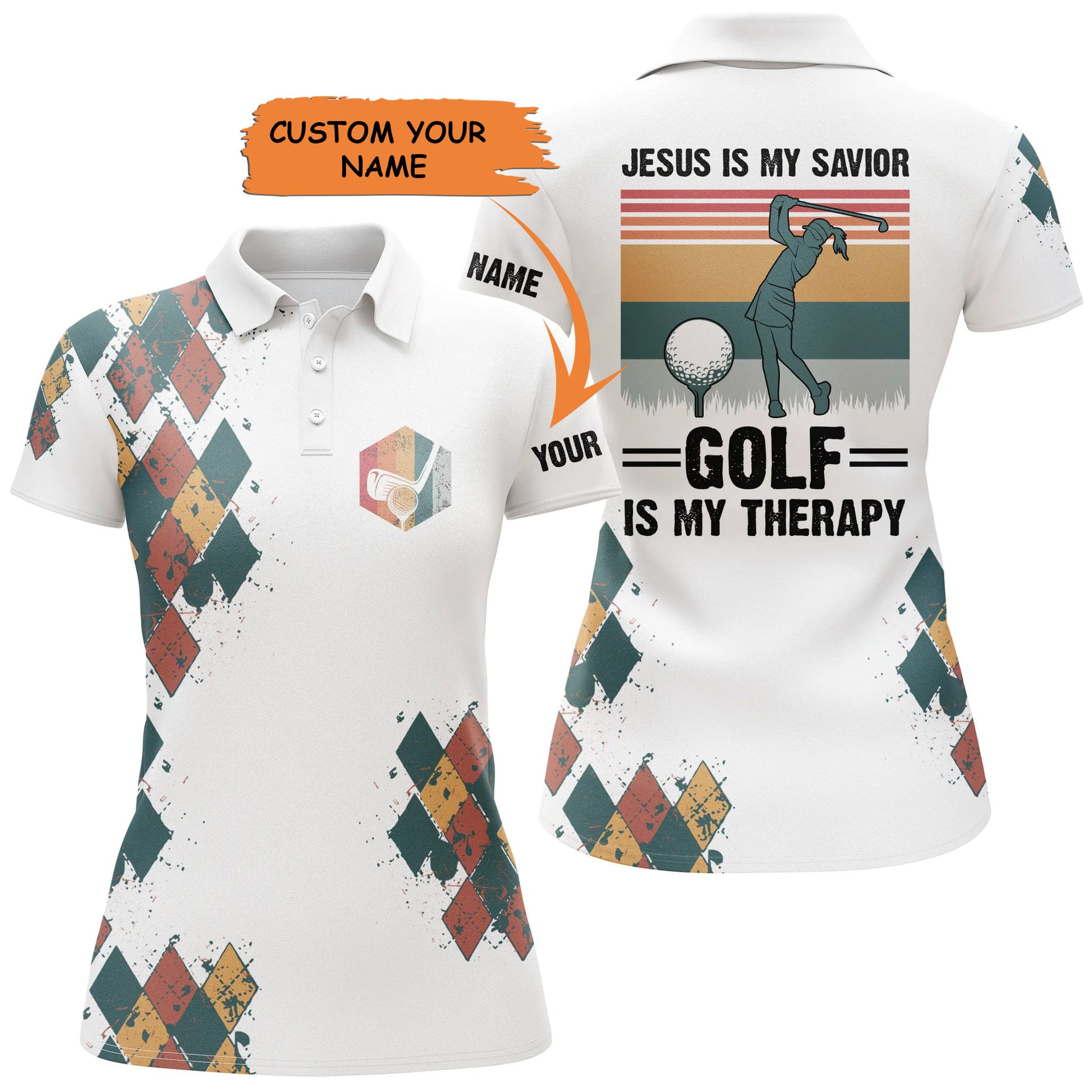 Womens Golf Polo Shirt Jesus Is My Savior Golf Is My Therapy Custom Name Vintage Ladies Golf Tops, Best Gift For Women